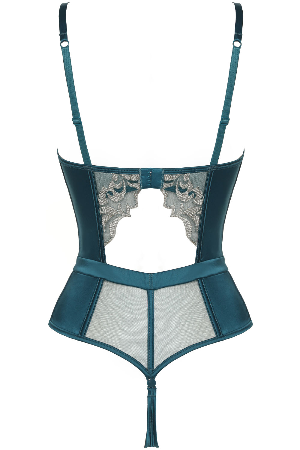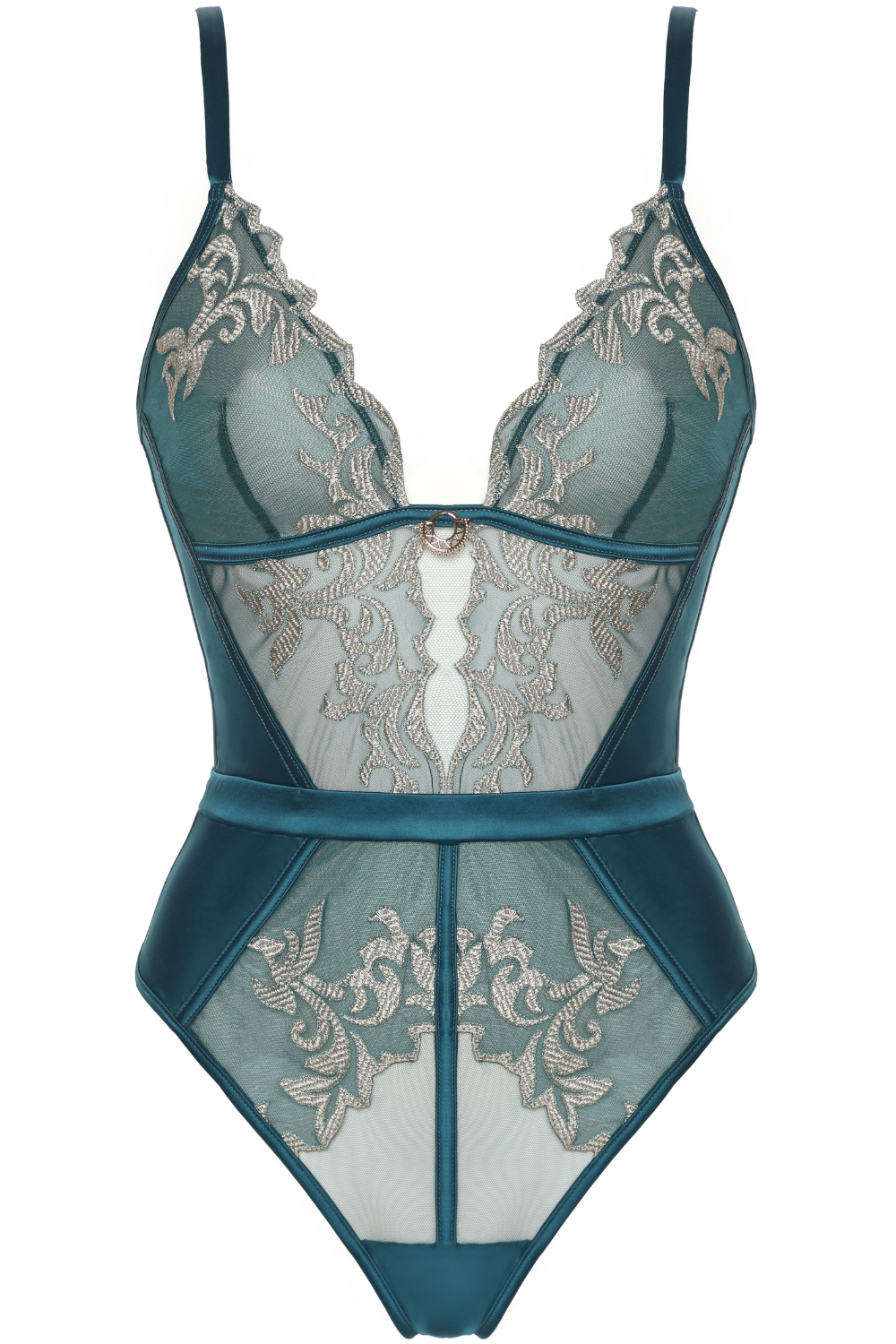 The Venus teal Bodysuit blends silky satin with delicate embroidered mesh. Underwired cups provide lift and support, while the thong cut creates a sleek, sculpted silhouette inspired by ocean-born femininity.