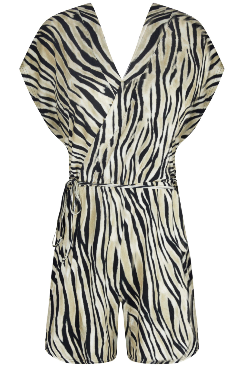 Embrace effortless elegance with the striking La Tigre Blanc beach playsuit, featuring a bold tiger print. The wrap-effect bust and V-neckline create a flattering silhouette, while short sleeves offer practical coverage. An elasticated waistband with a tie detail ensures a comfortable, adjustable fit.