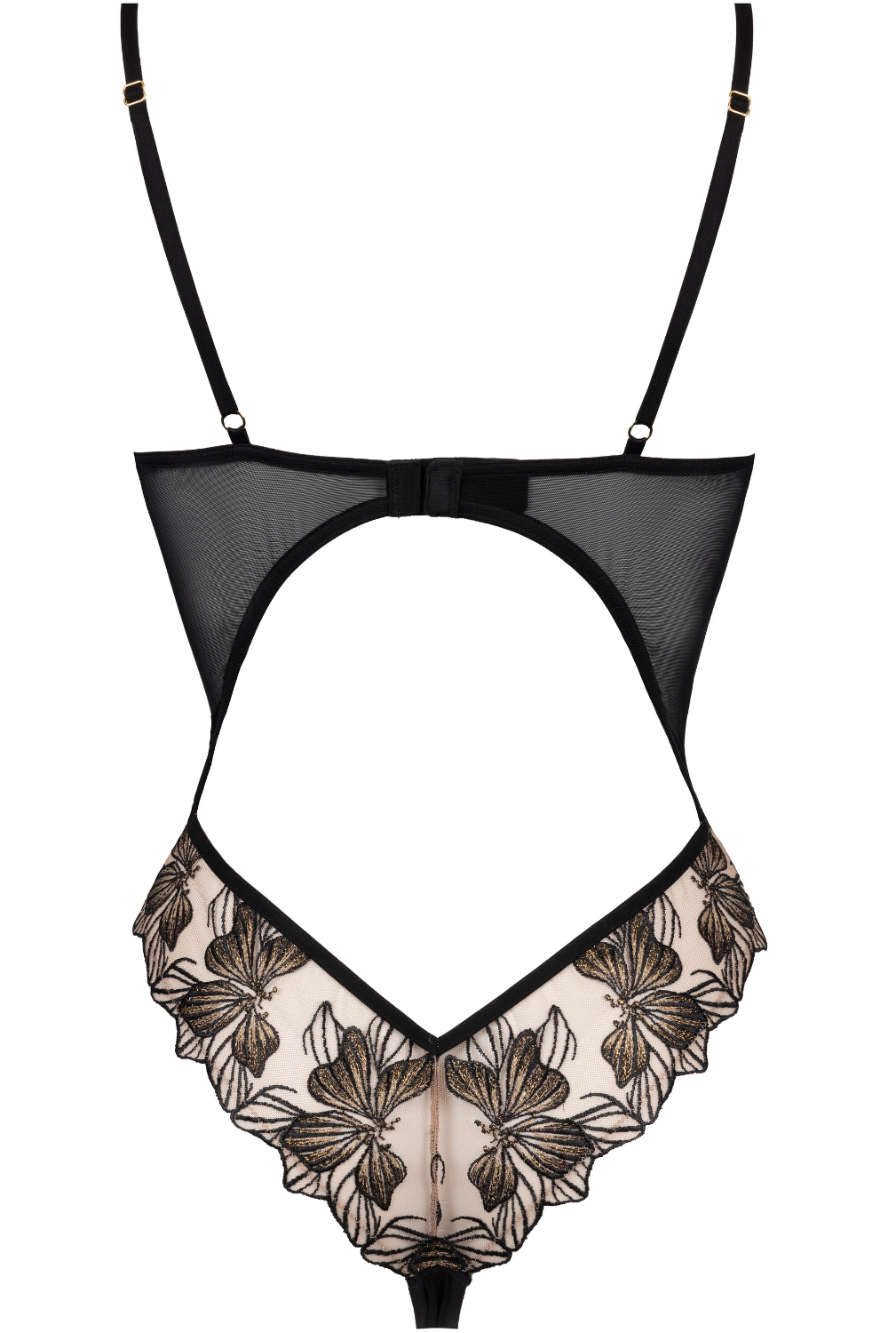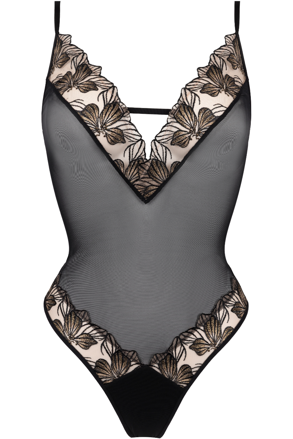 Crafted from sheer black mesh and adorned with golden floral embroidery, this thong bodysuit sculpts the body with elegance while leaving a whisper of skin revealed.
