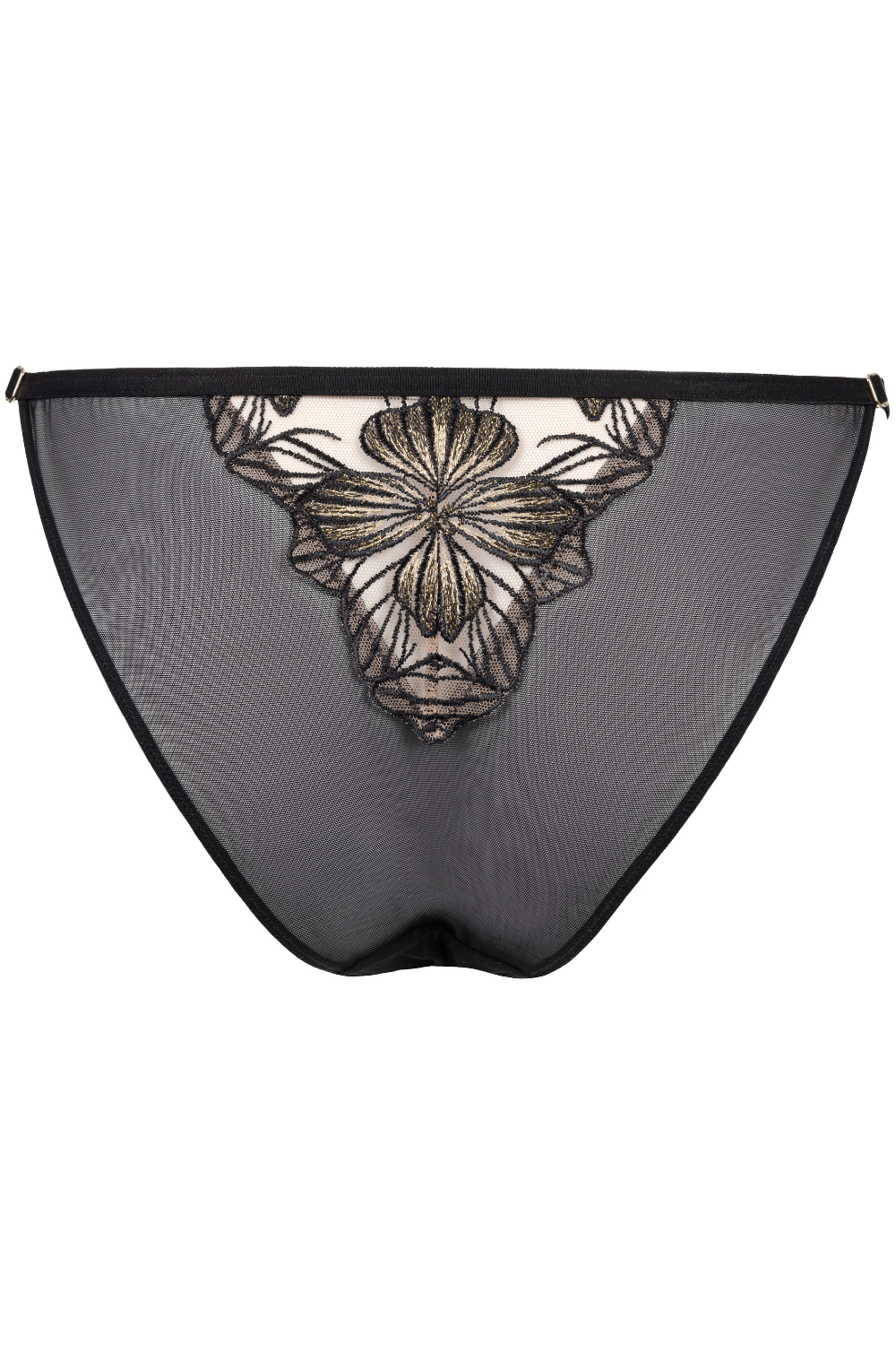 The back reveals a softly scalloped embroidered panel that frames the curves with elegant allure, while thin adjustable sides ensure the perfect fit.