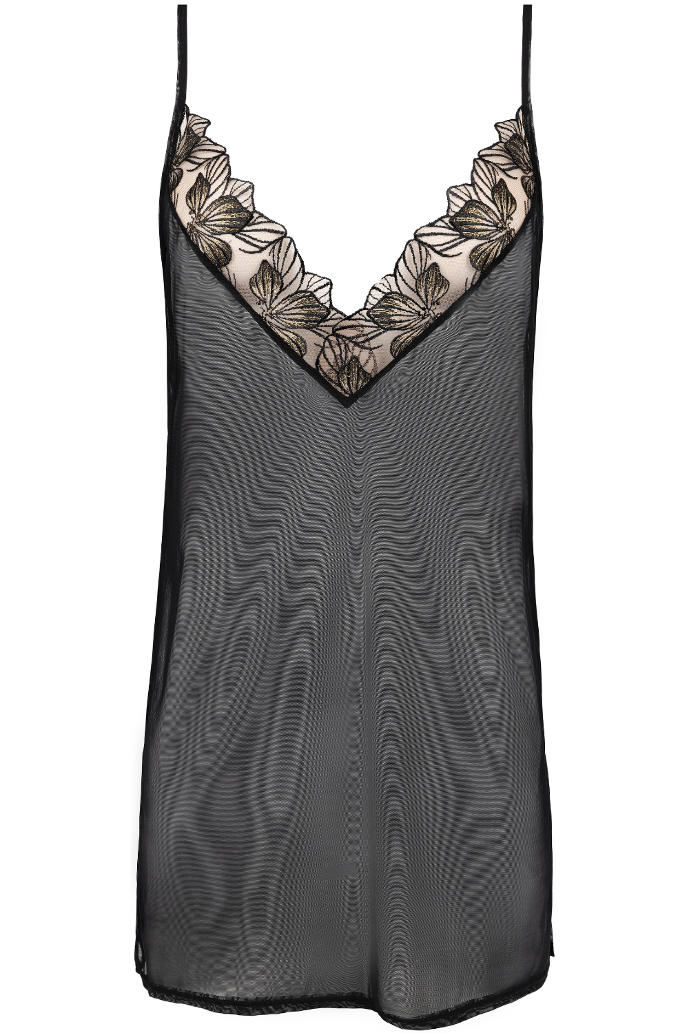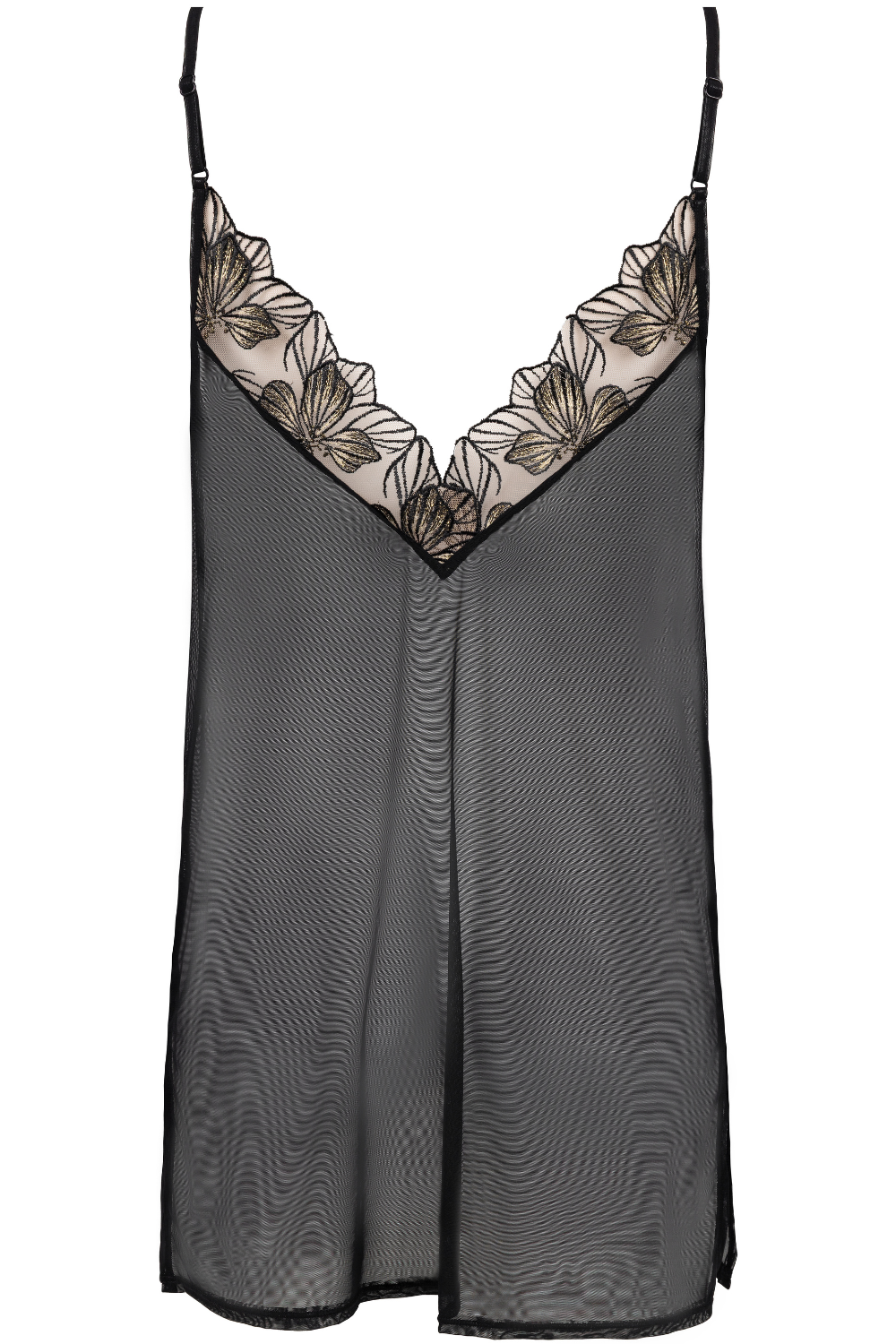 Slip into effortless seduction with the Fleur Défendue Nightie by Atelier Amour — a sheer black babydoll that shimmers with golden floral embroidery. Crafted from soft, flowing mesh, this delicate nightdress drapes beautifully over the body, revealing just enough to entice. The plunging V-neckline, framed with luminous embroidered tulle, flatters the décolleté, while adjustable shoulder straps ensure the perfect fit. An exquisite piece of French nightwear designed to captivate long after dark.