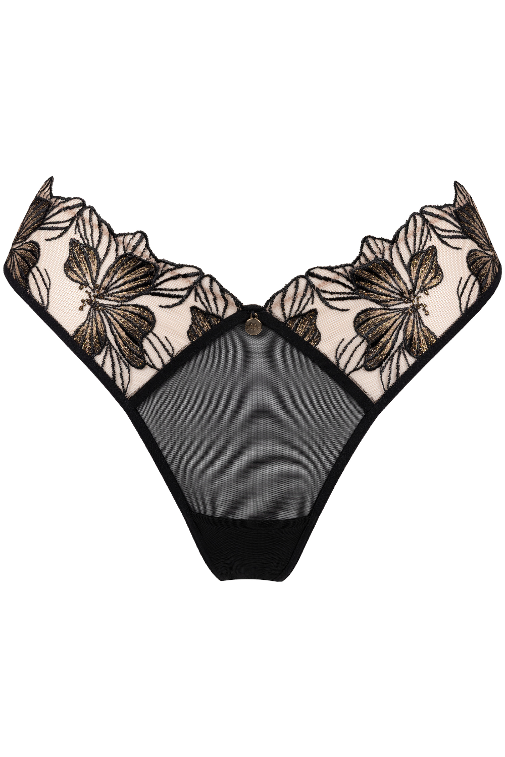 Crafted from sheer black mesh and embroidered tulle with golden highlights, this elegant tanga thong combines comfort with irresistible sensuality.