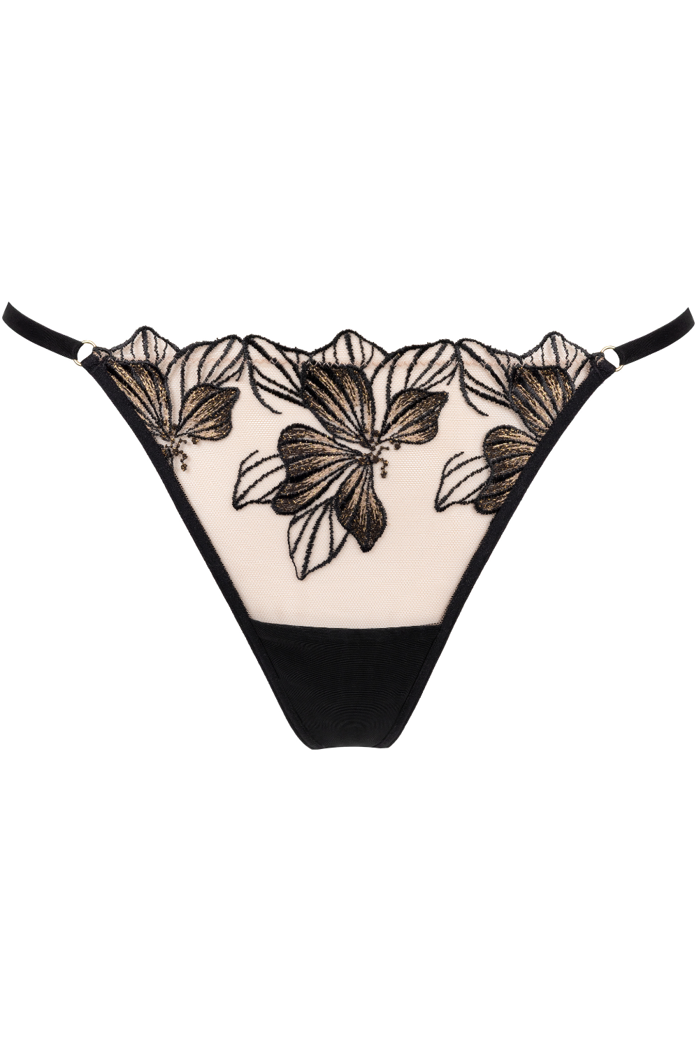 Crafted from embroidered tulle with golden highlights, this refined mini thong traces soft floral motifs against the skin for a breathtakingly elegant effect.