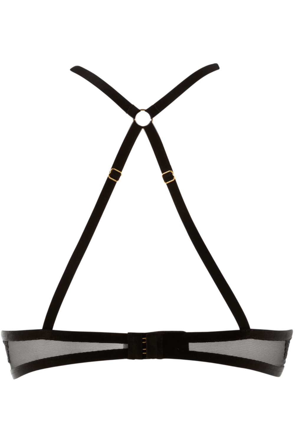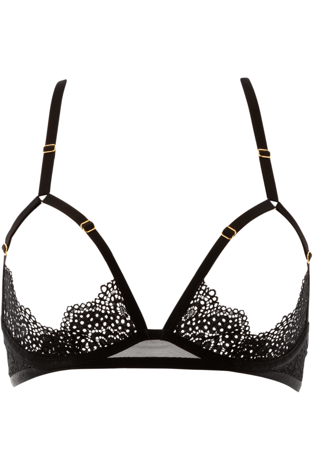 Atelier Amour's Nommée Désir collection brings a hint of mystery and sophistication to feminine curves. Cut from black mesh and delicate lace, the Nommée Désir cupless bra features underwired cups to provide light support. The transparent lace draws the eye downwards, whilst the graphic elastic bands showcase the breasts for the most irresistible look.