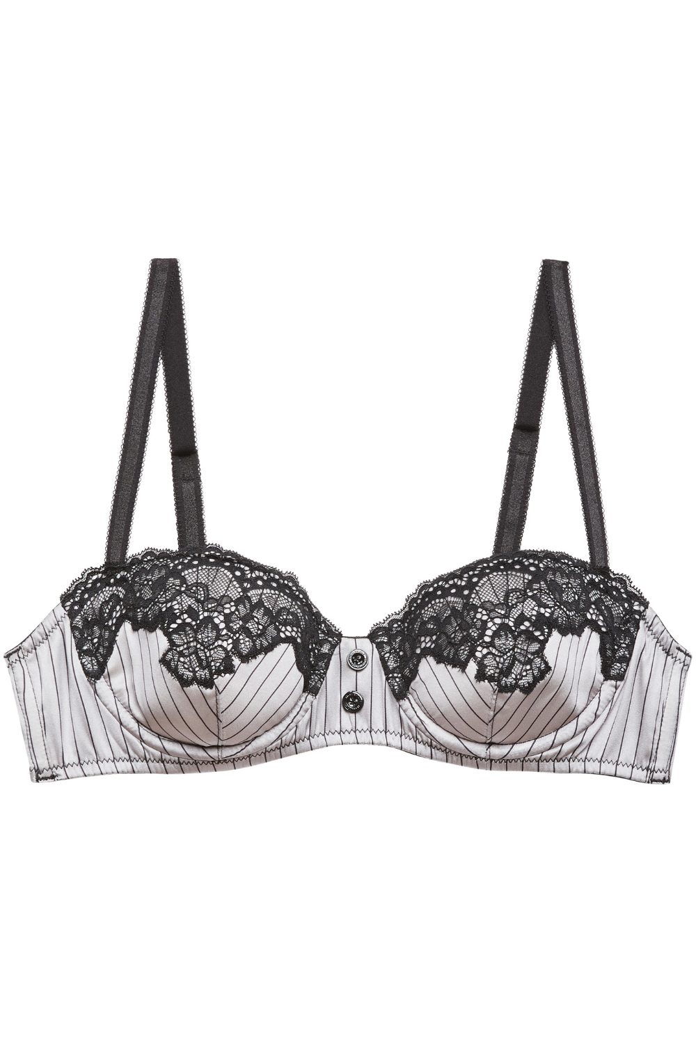Fleur du Mal Executive Pinstripe Silk Balconette Bra – Black Pinstripes with Lace Trim.