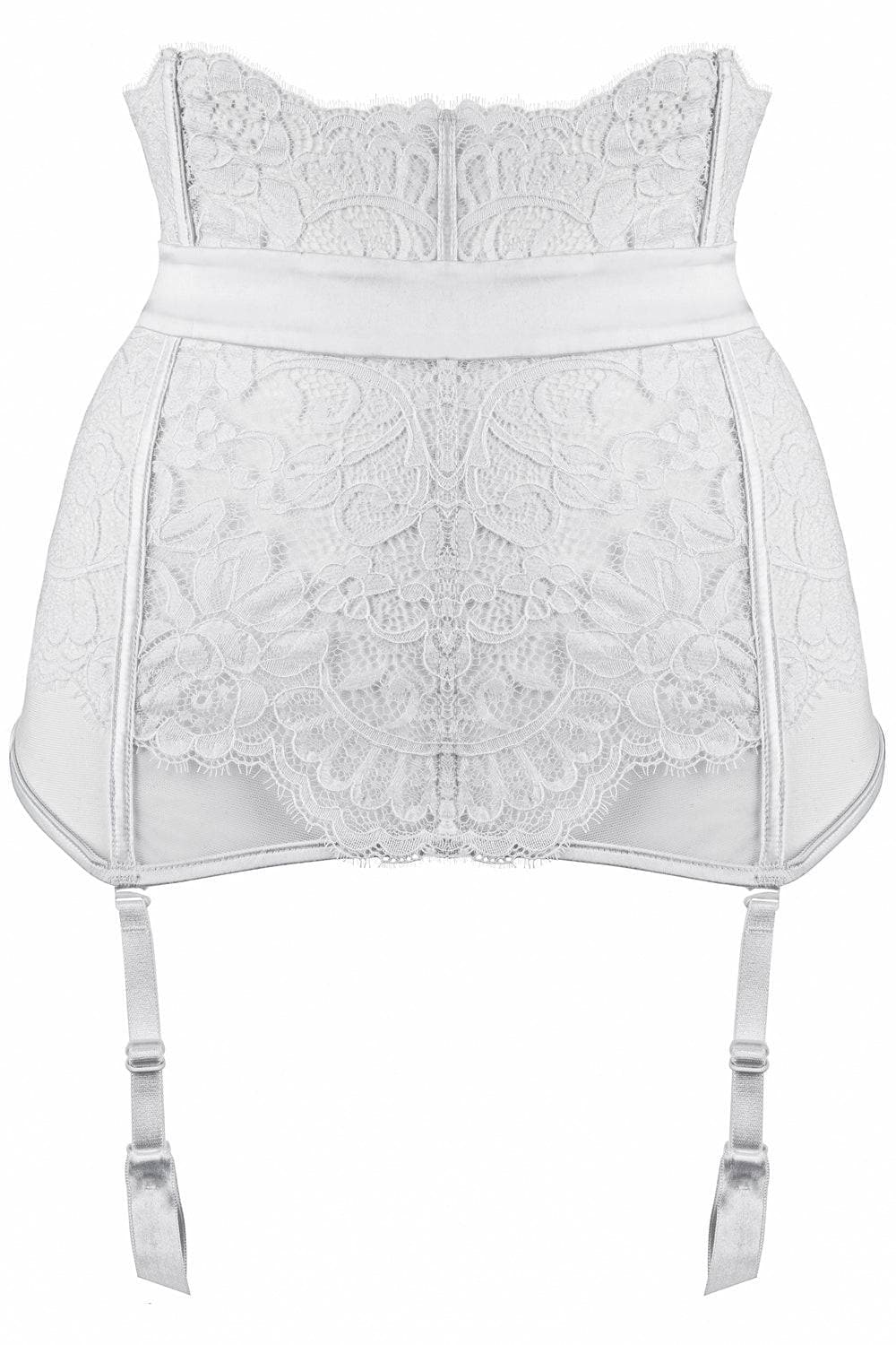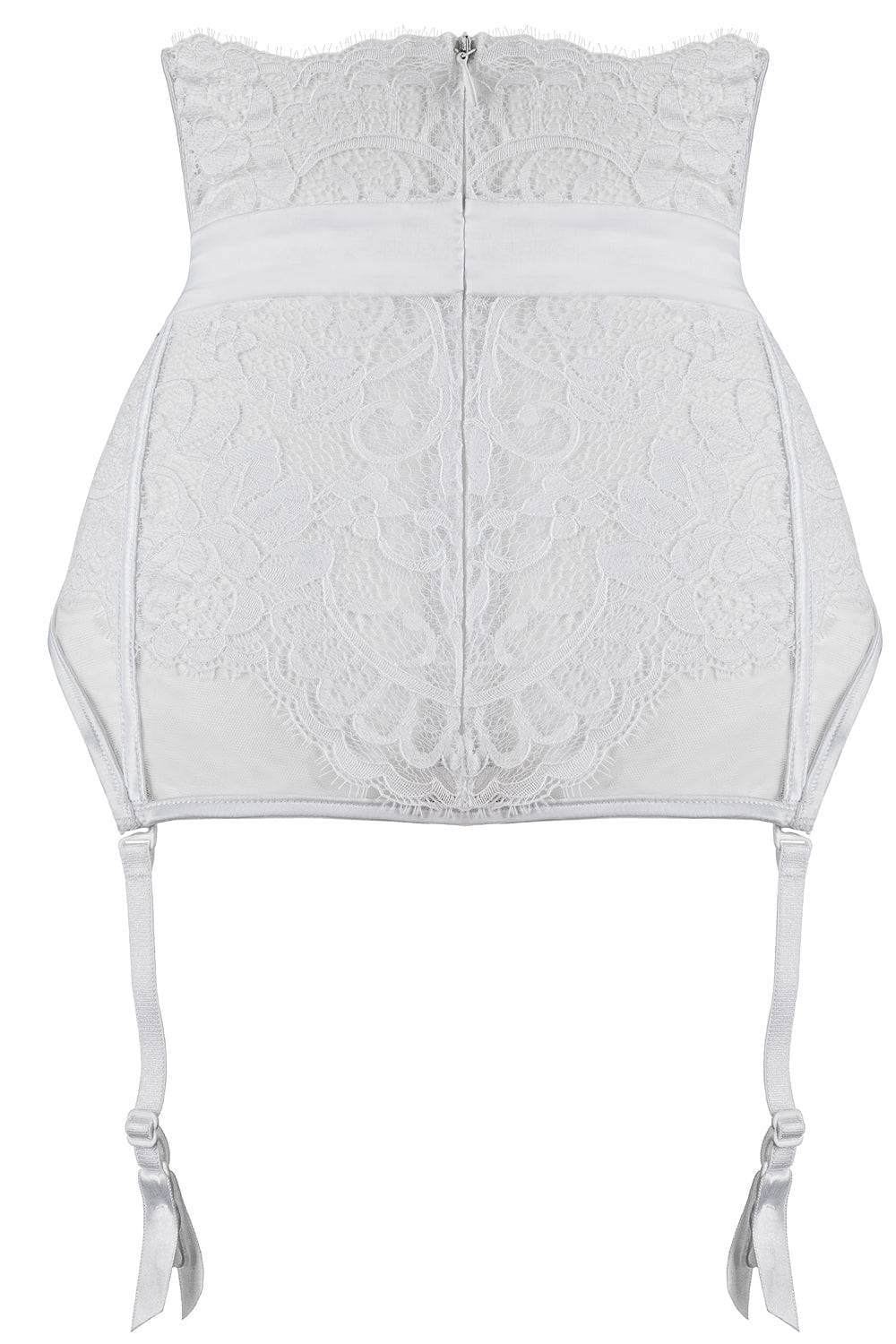 Accenture your feminine curves with the irresistible Marlene suspender by Prelude. This wide four strap suspender belt is crafted from soft lace, sheer tulle and satin in white. Swarovski Crystals sit on the centre front for added glamour.