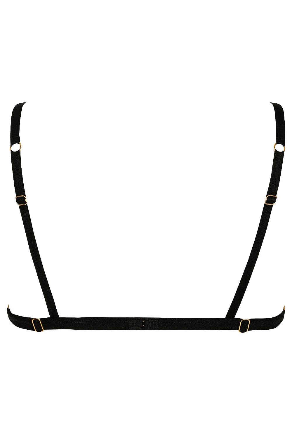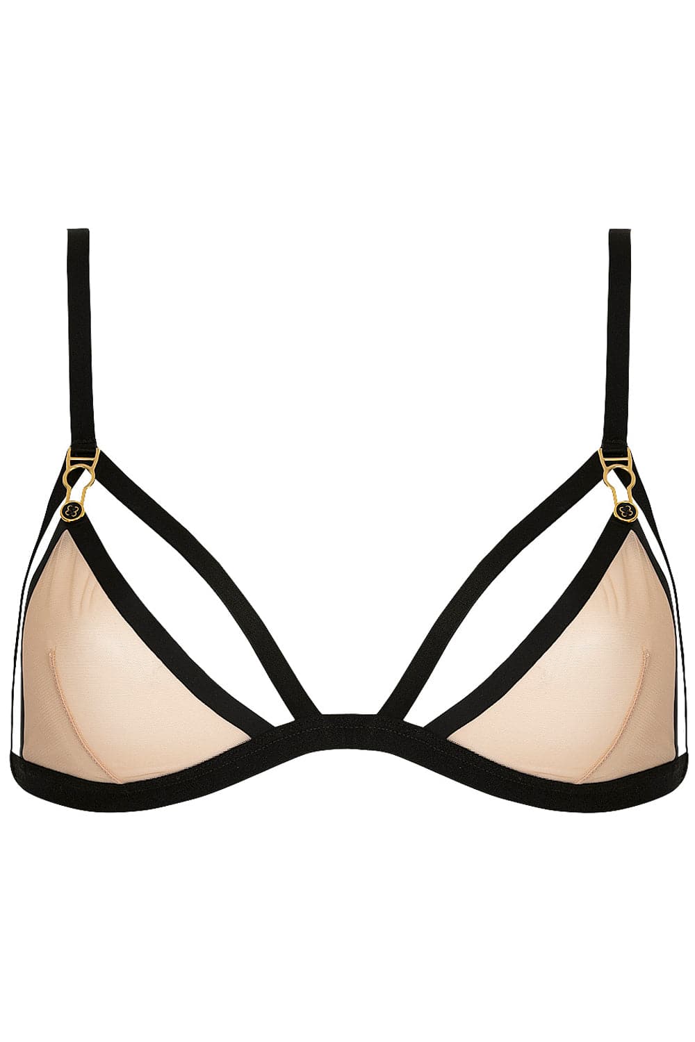 Atelier Amour uses luxurious fabrics that make every piece feel both special and sexy. Designed for love games and body exploration the 'Insoutenable Légèreté' bra is crafted from soft sheer nude tulle and black elastic straps. Atelier Amour signature clips can be unclipped to uncover the breasts. Soft triangular cups free from padding and wires provide a natural cleavage.