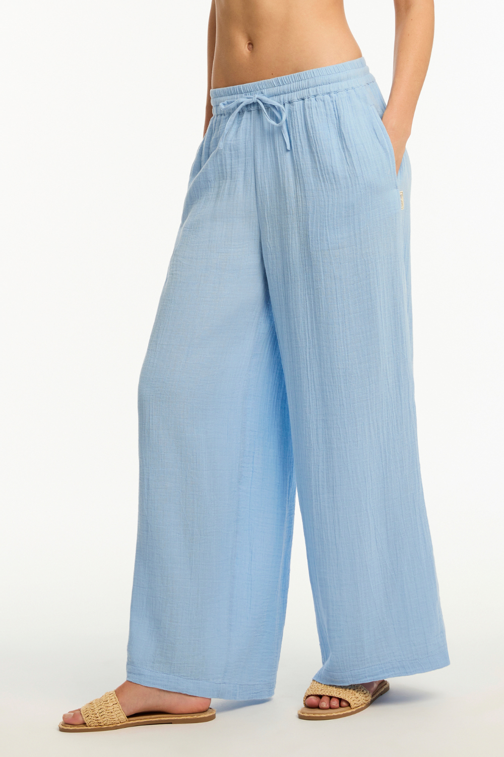 The Sunset Cotton Beach Pants in Cornflower Blue by Sea Level are made from soft cotton cheesecloth, featuring side pockets, a front drawstring, and an elasticised high waist. The ultimate wear-anywhere look for beachside cool and beyond.