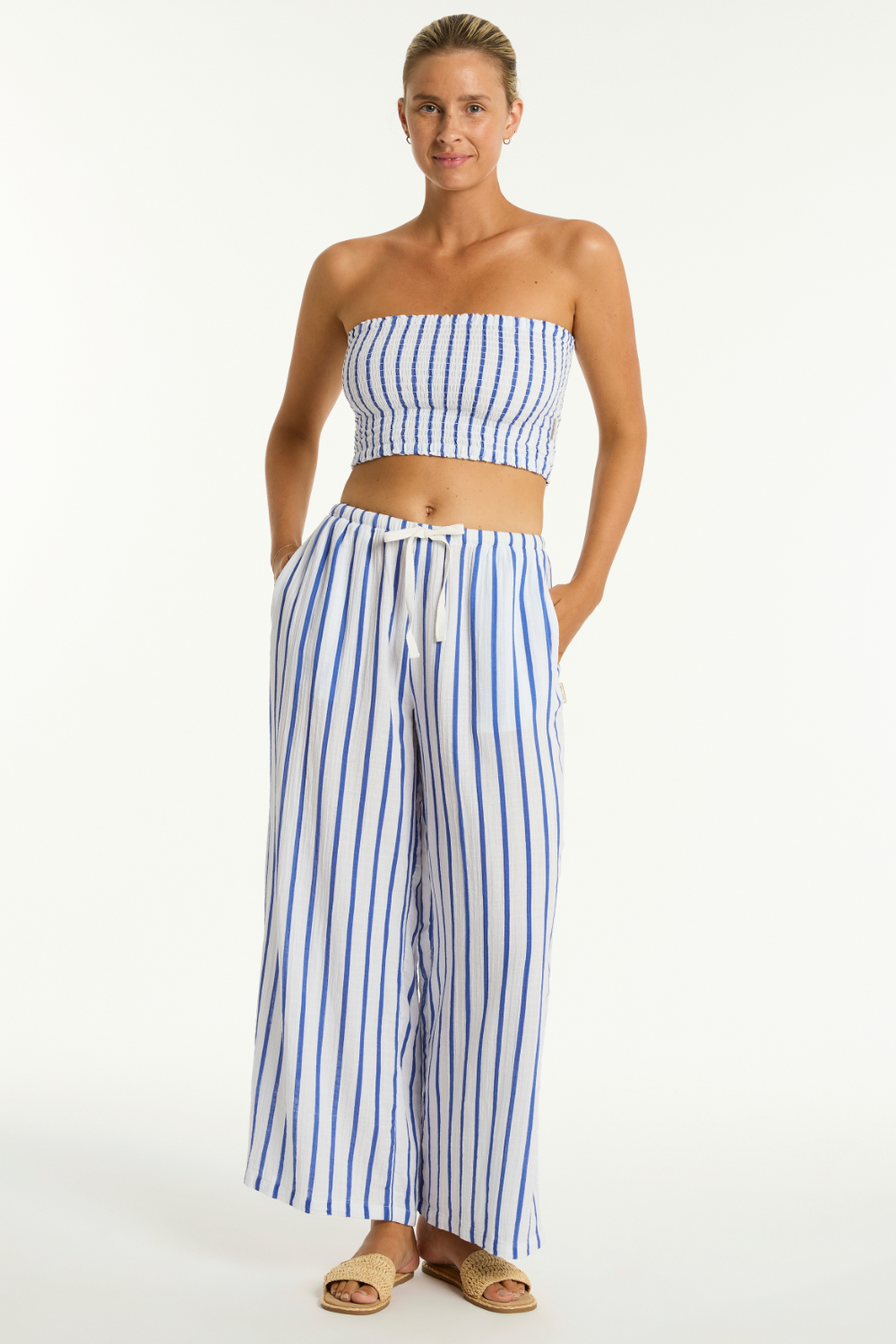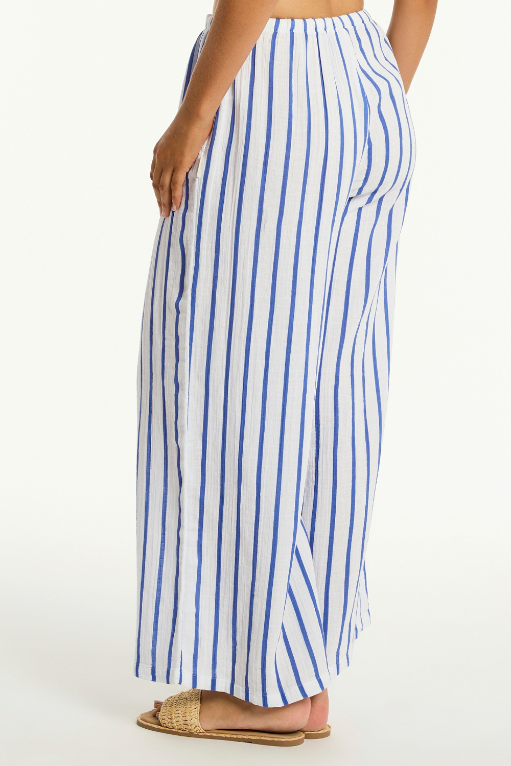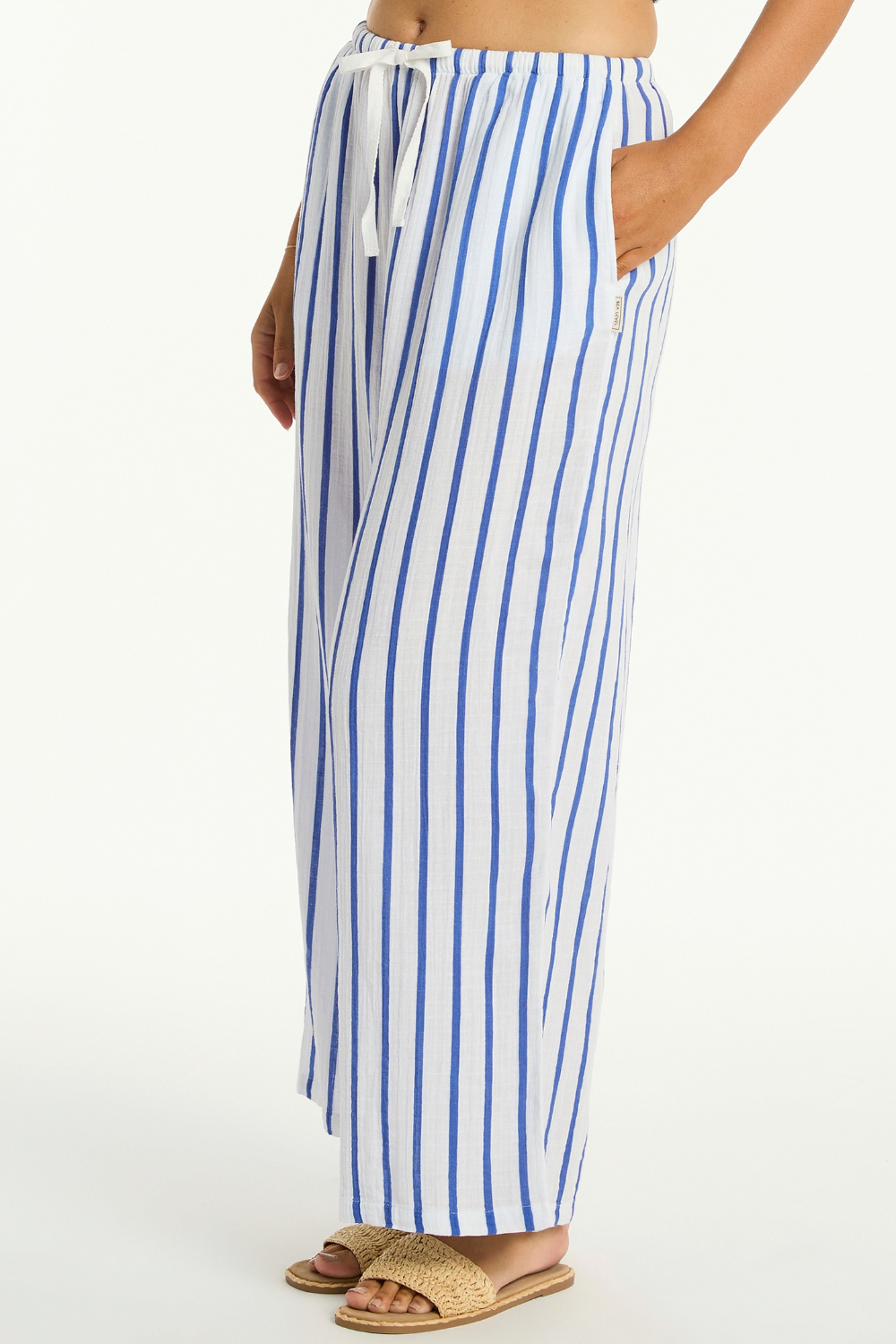 Sea Level’s Amalfi Blue Cotton Beach Pants feature bold stripes on soft double cotton gauze. With a high waist, wide leg, side pockets, and drawstring waist, they offer breezy elegance for effortless holiday styling.