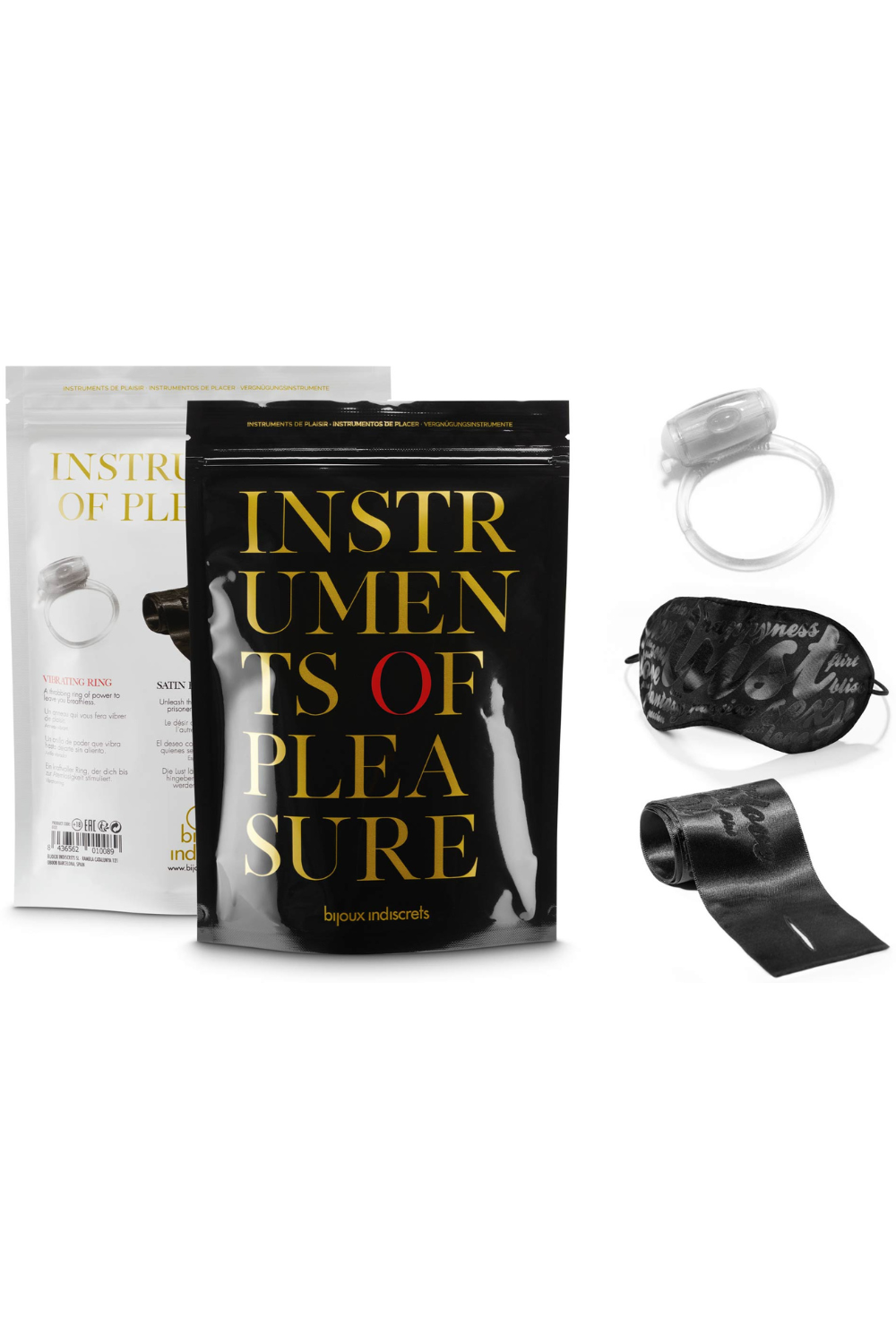 Indulge in ultimate seduction with the Instruments of Pleasure Red Edition by Bijoux Indiscrets. This luxurious 3-piece accessory set includes a vibrating pleasure ring, soft satin restraints for enticing bondage play, and an elegant satin blindfold to heighten your senses. Perfect for exploring your desires with a touch of sophistication.