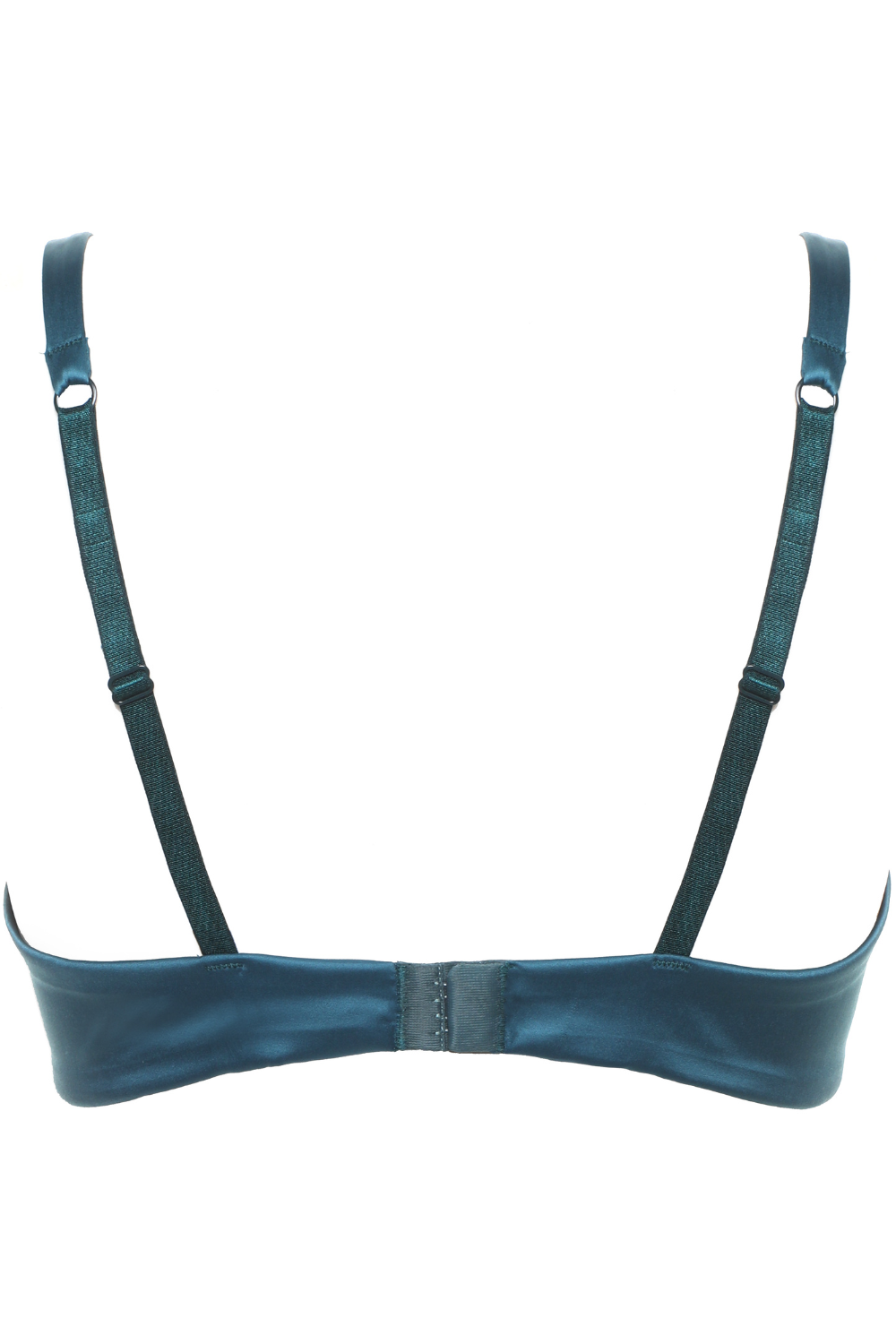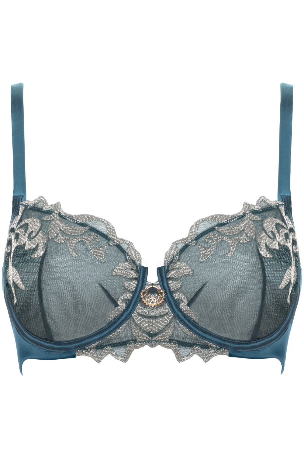 The Venus Balcony Bra in teal combines delicate embroidered mesh with a soft satin back and trims. Underwired cups lift and support the bust, creating a beautifully shaped, feminine neckline inspired by ocean-toned elegance.