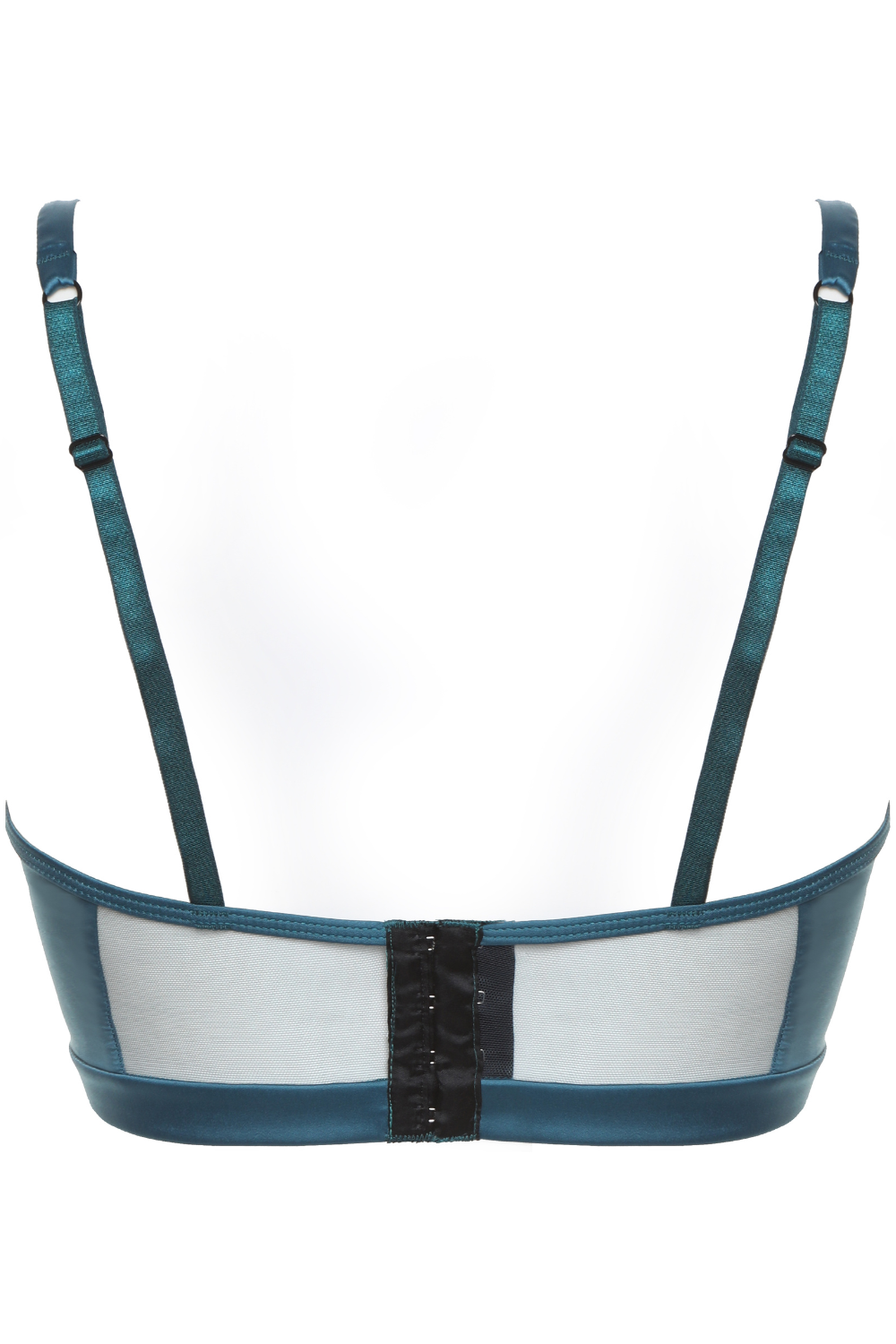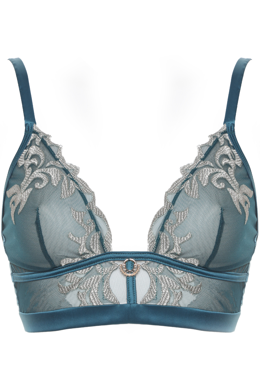 The Venus Bralette in teal combines silky satin with delicate embroidered mesh for effortless elegance. Wireless cups offer natural lift and comfort, creating a soft, fluid silhouette inspired by ocean hues and goddess-like femininity.