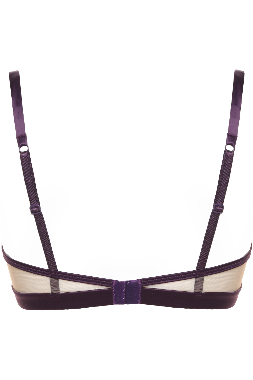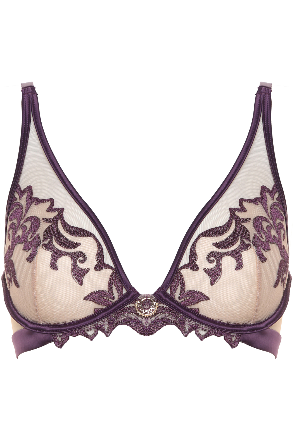 The Venus Triangle Plunge Bra in violet blends intricate embroidered mesh with soft satin trims. Underwired triangle cups shape and support the bust, creating a flattering plunge silhouette with romantic, goddess-like elegance.
