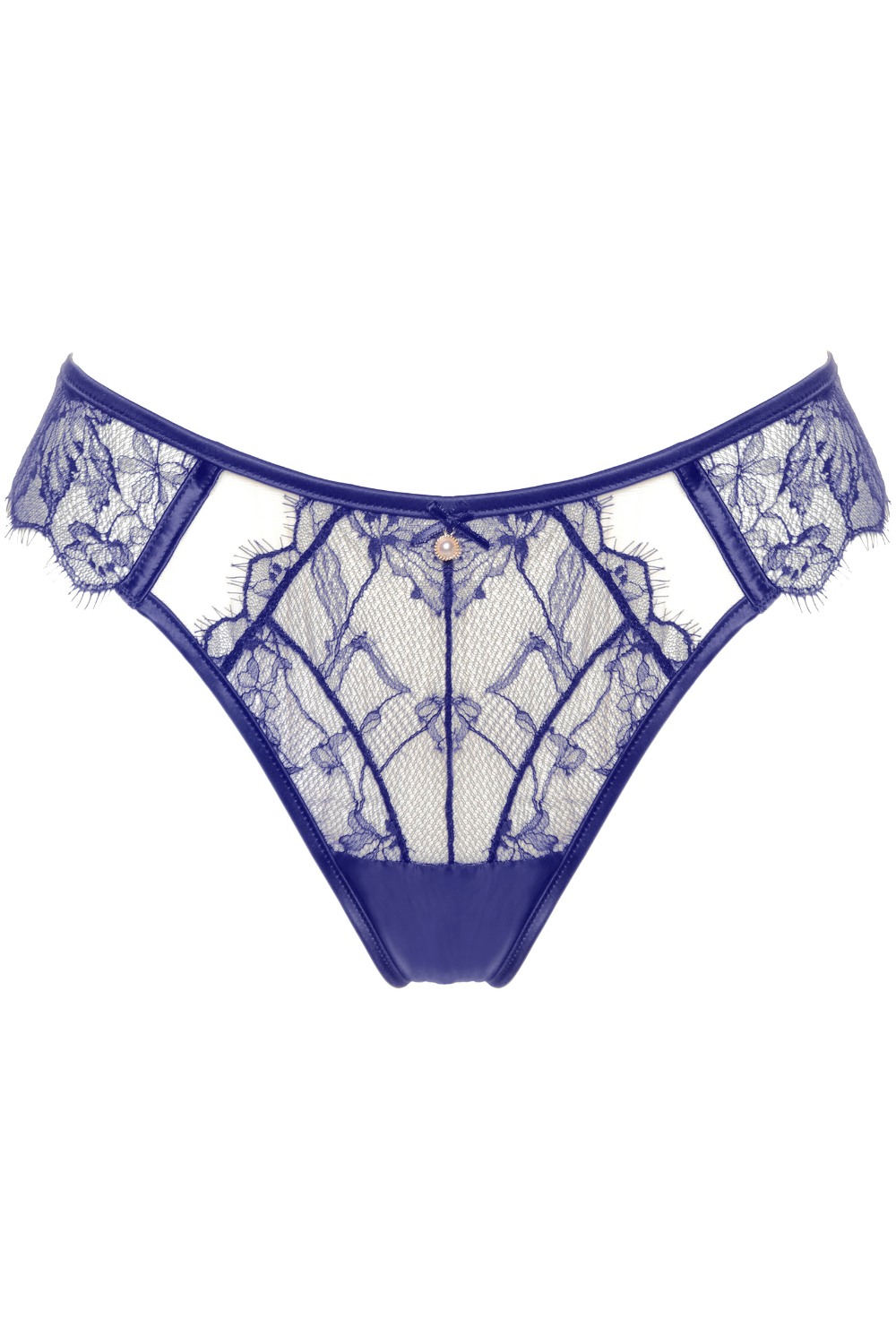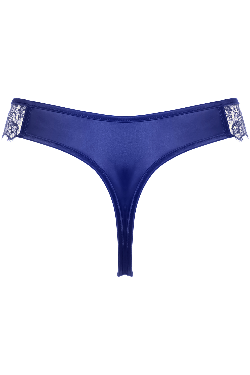 Royal Blue Pearl Thong featuring delicate lace, eyelash trim, and satin back. A luxury tanga with cotton gusset for comfort and timeless elegance.