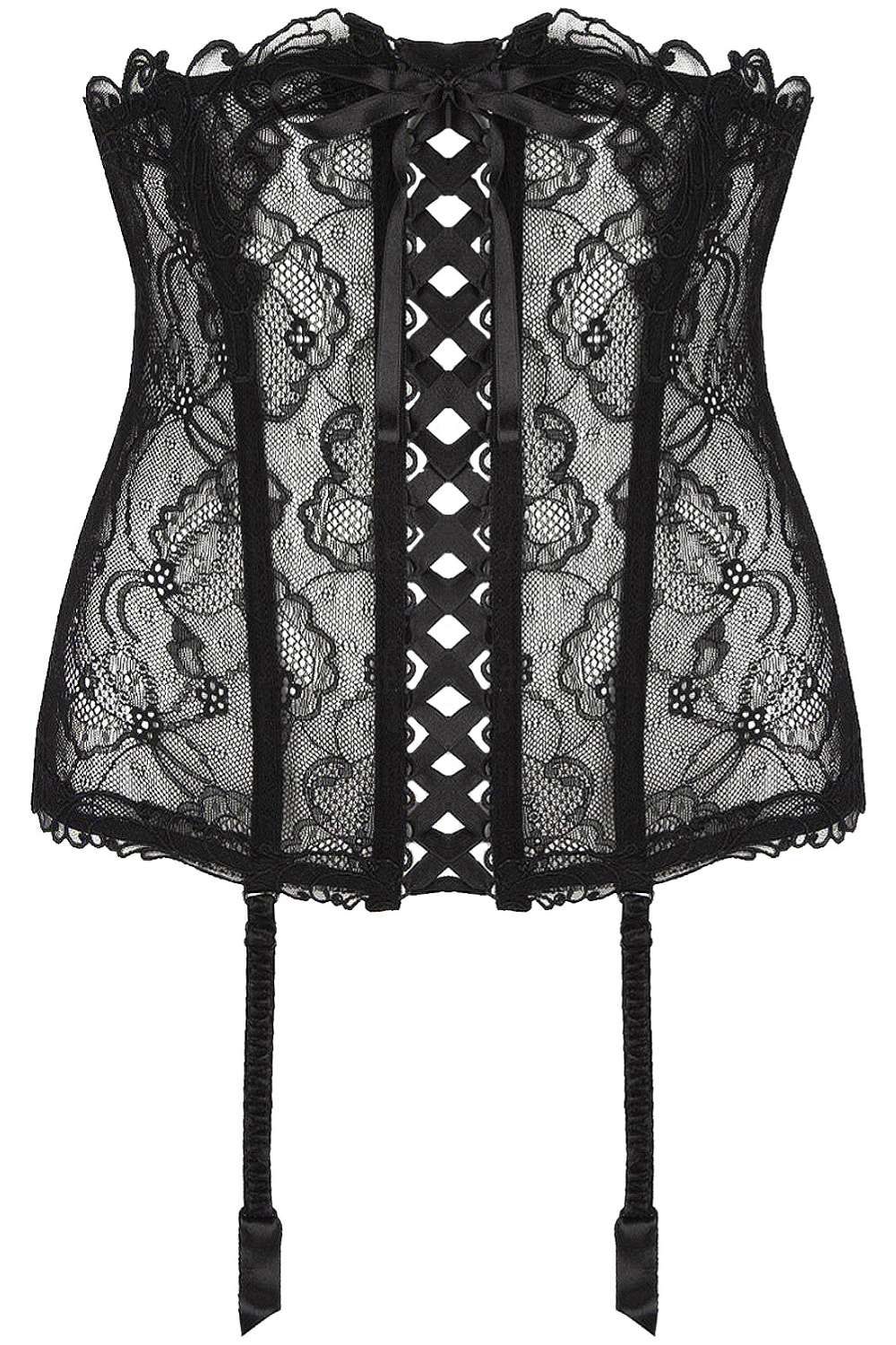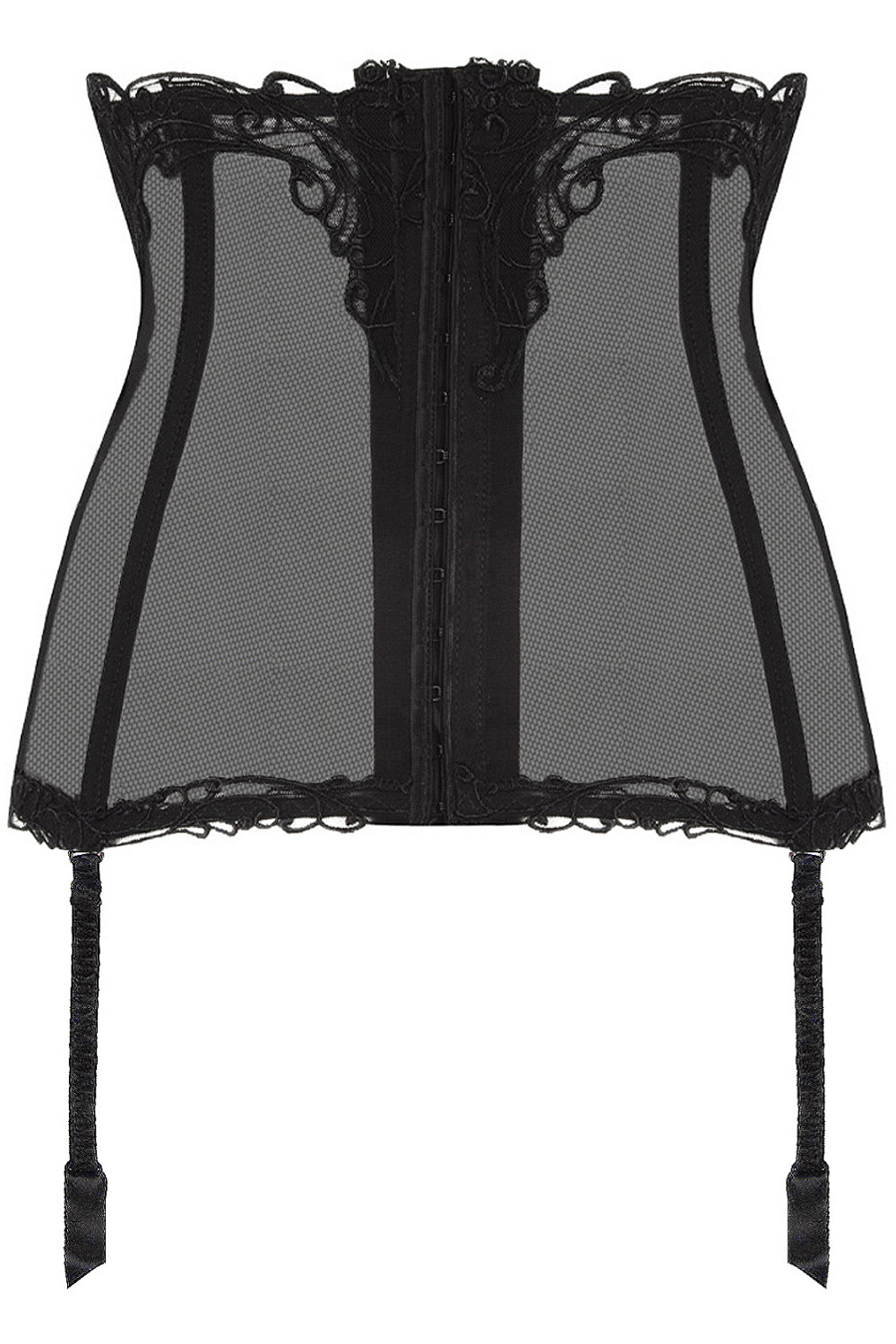 The waistband is delicately adorned with fine guipure embroidery, and the look is finished with four adjustable stretch suspenders, allowing you to pair it beautifully with your favourite black stockings.