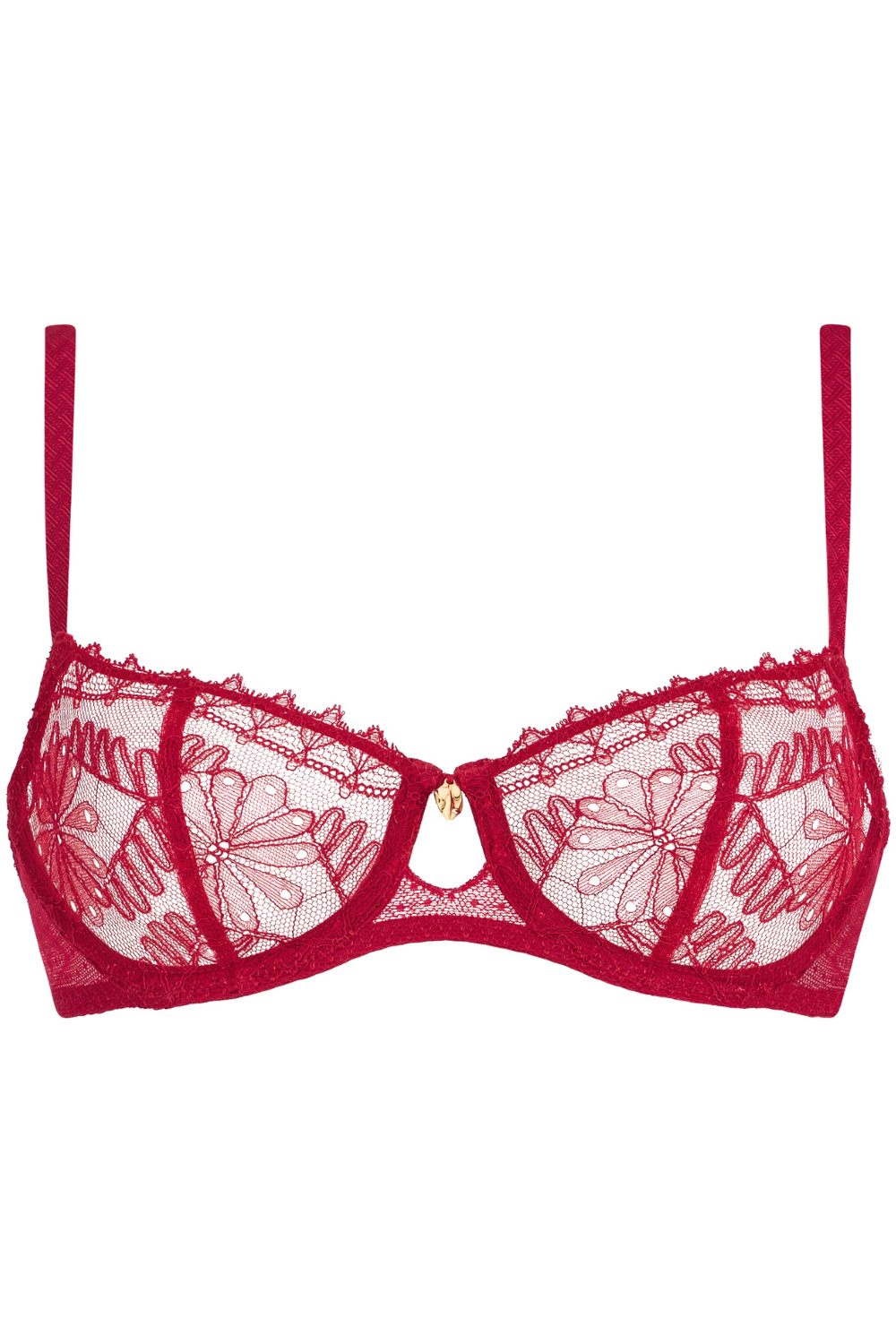 The Mystery of Love Half Cup Bra elevates the silhouette with underwired, unpadded cups crafted from delicate Leavers de Calais lace. Airy dotted Swiss tulle adds softness and breathability, while the luminous cherry red hue celebrates femininity with natural grace.