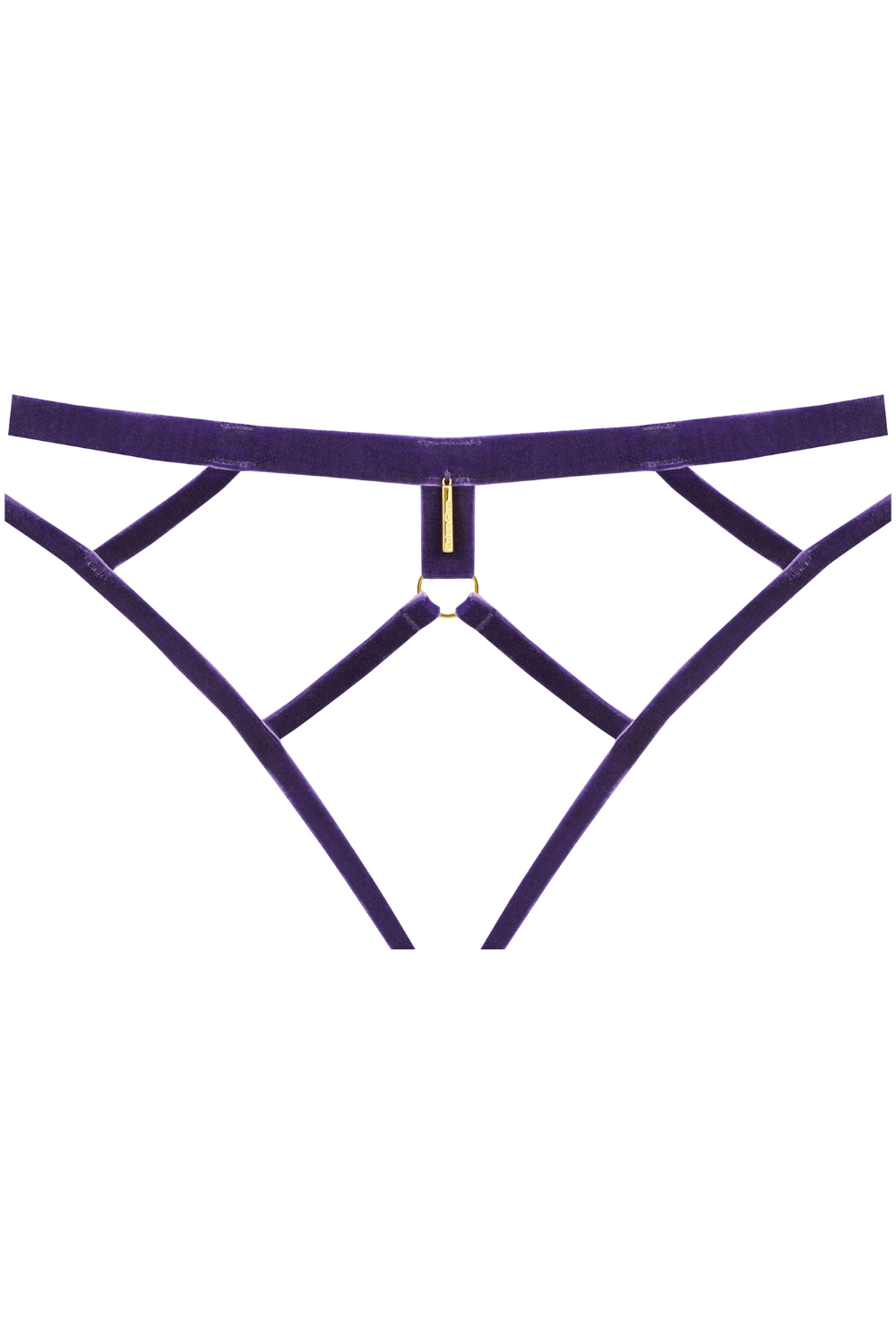 The Maison Close Les Fétiches Velvet Open Brief in purple seduces in soft-touch velvet. Crotchless and strappy, it’s enhanced with golden hardware and the Maison Close engraved tassel for a refined, enigmatic allure. Pair with the matching purple harness to create a strappy ouvert bodysuit.