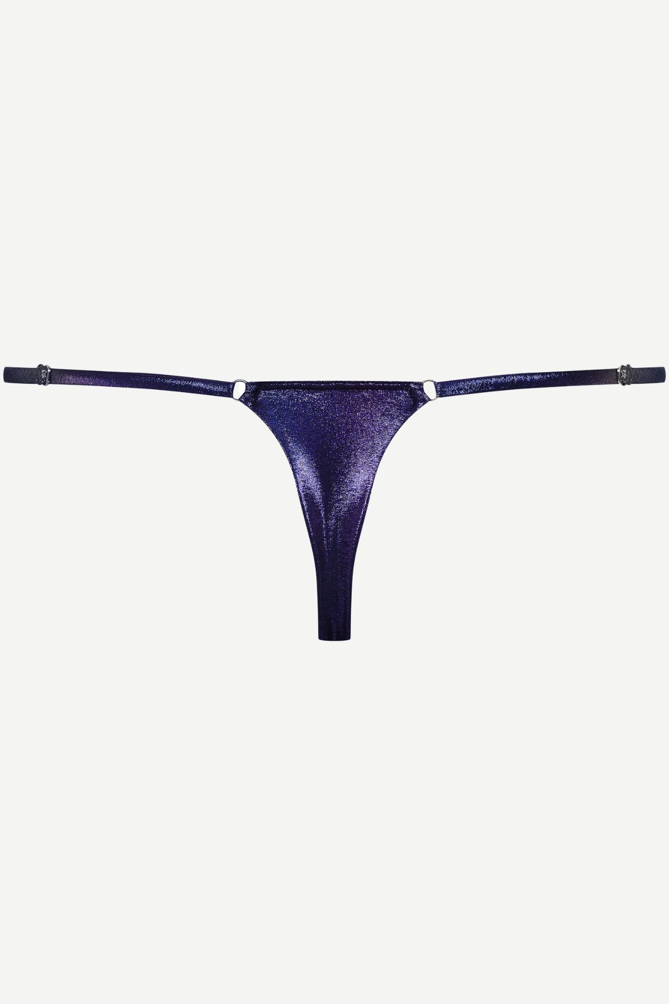 The most minimal piece in the SPLASH collection, and entirely intentional about it. Cut from the same iridescent metallic microfiber - that shifting, liquid blue-violet - in the smallest silhouette Maison Close make. This is not a piece for the ambivalent.