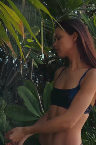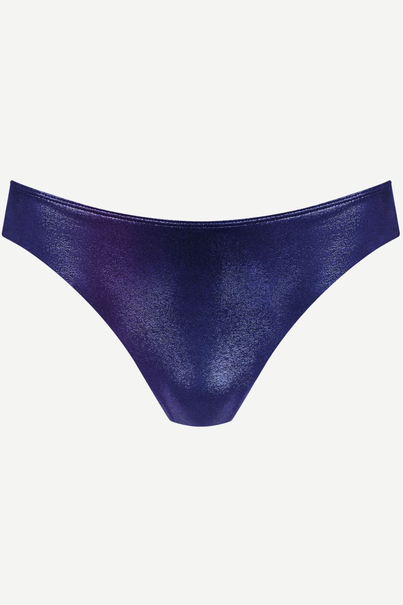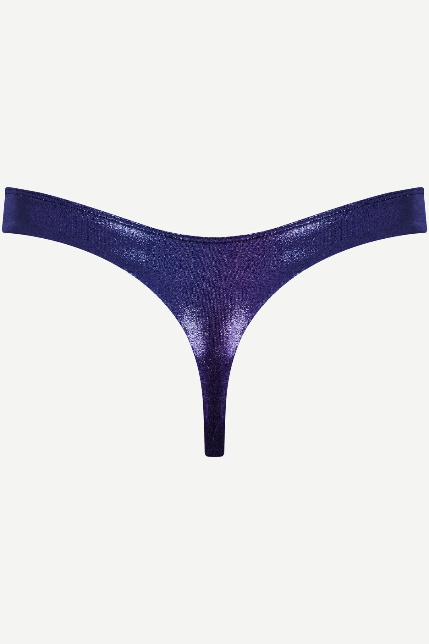 High at the hip, minimal at the back, and finished in that signature metallic microfiber that moves with the light. The thong bottom that works equally well with both tops - or, quite frankly, on its own terms. Available in three colourways if the blue feels like a commitment you're not yet ready to make.