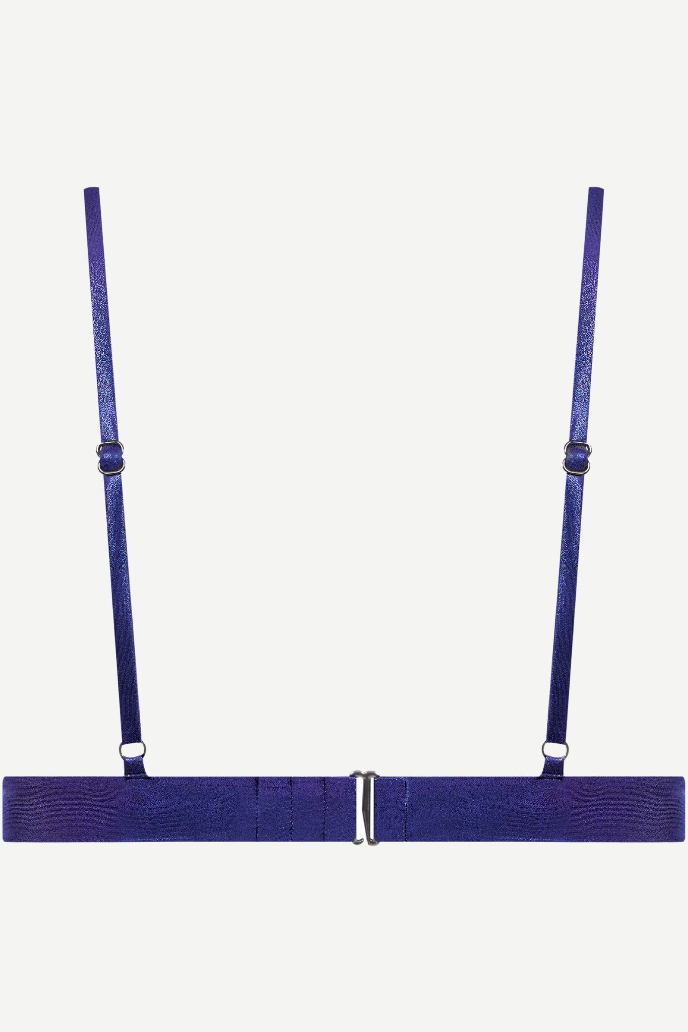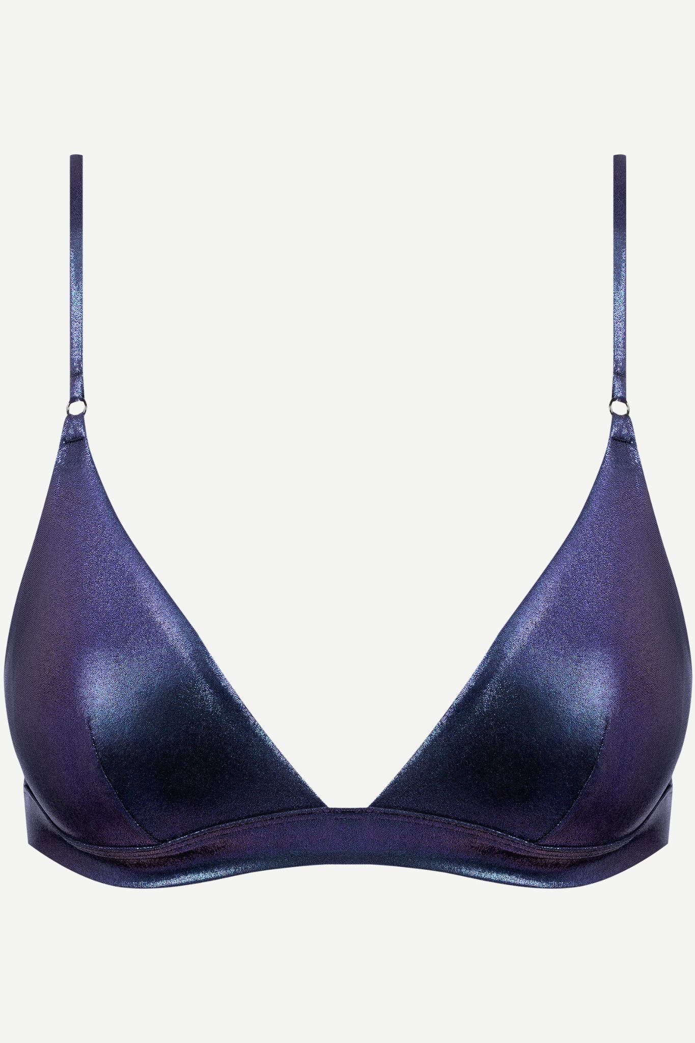 The triangle is swimwear's most honest shape, and Maison Close haven't tried to improve it. What they have done is make it in an iridescent metallic microfiber that catches light like water moving - shifting between deep navy and blue-violet depending on the angle. Wire-free with lined, darted cups and fully adjustable straps. The kind of top that looks effortless because everything has already been considered.