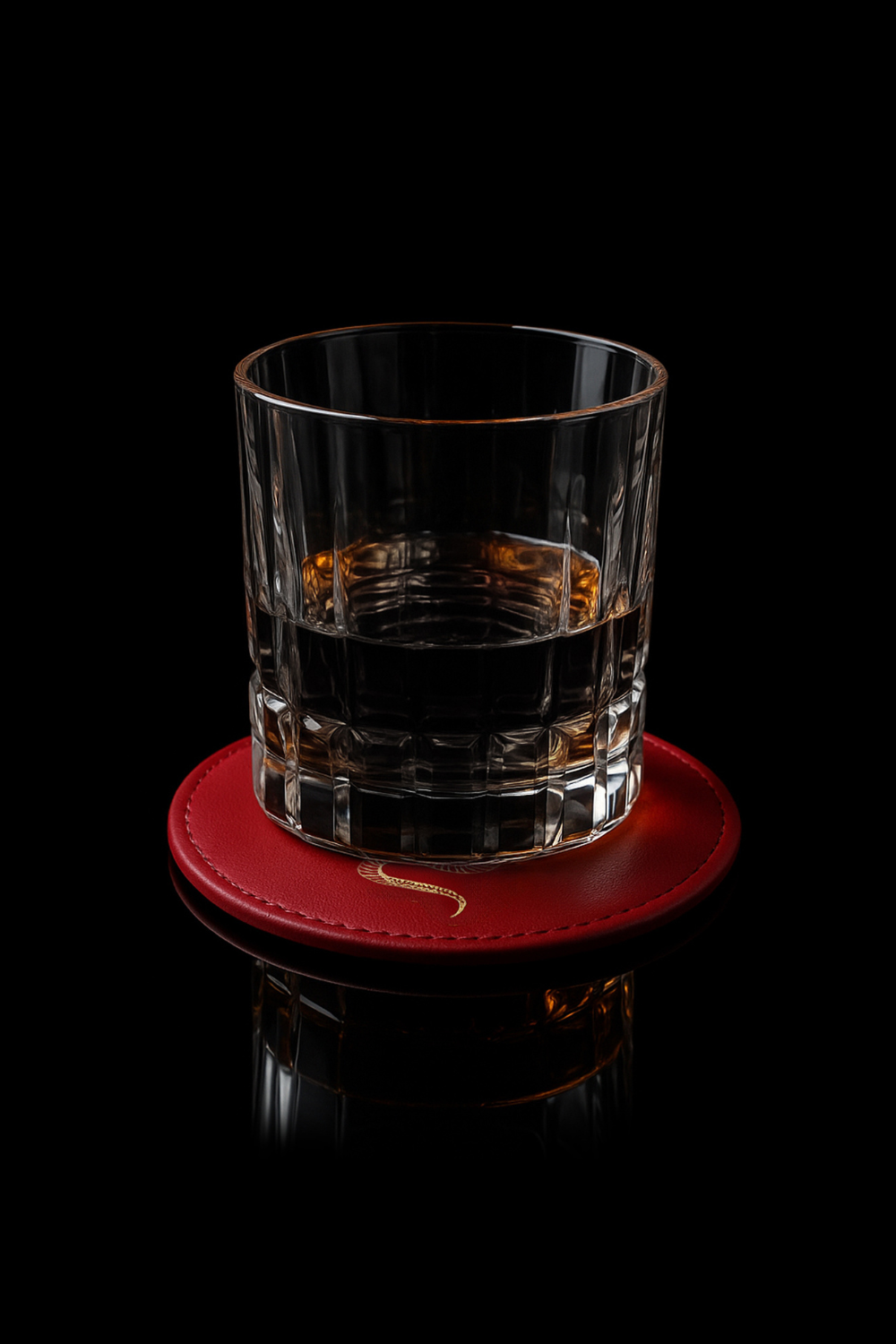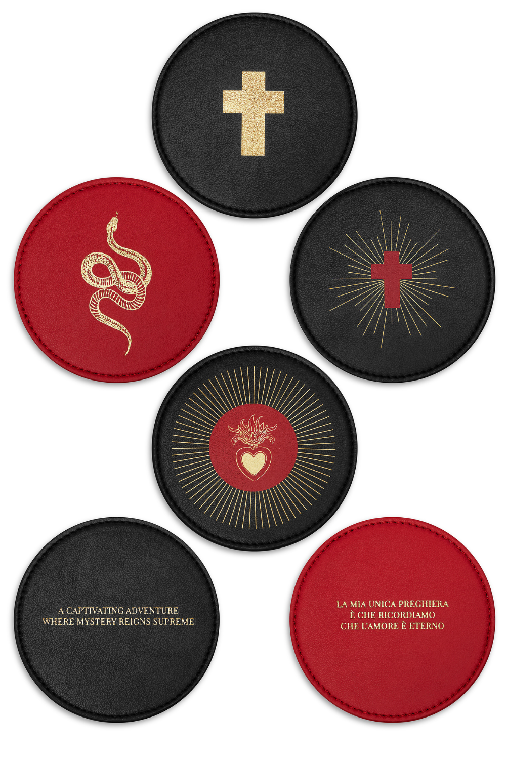 Elevate intimate moments with Vino Veritas, a set of six symbolic coasters from Maison Close's Curiosités Désirables© collection. Featuring two red and four black pieces illustrated with powerful Maison Close motifs, the set blends elegance with subtle provocation. Refined details — edge dyeing, tone-on-tone stitching, and a gold hot-stamped logo — make each coaster a collectable object of everyday seduction.