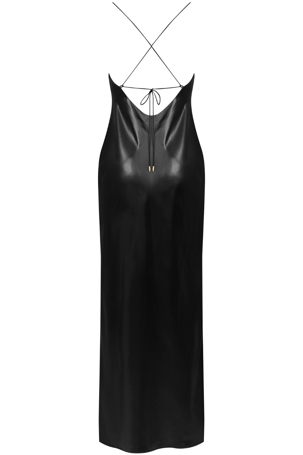 This striking long dress epitomises understated elegance with its daring backless design and fluid satin construction. The sculptural silhouette features a graceful cowl neckline suspended by delicate tie straps, whilst a dramatic open back commands attention. A side slit enhances movement and flatters the figure, whilst the form-fitting cut celebrates your curves.