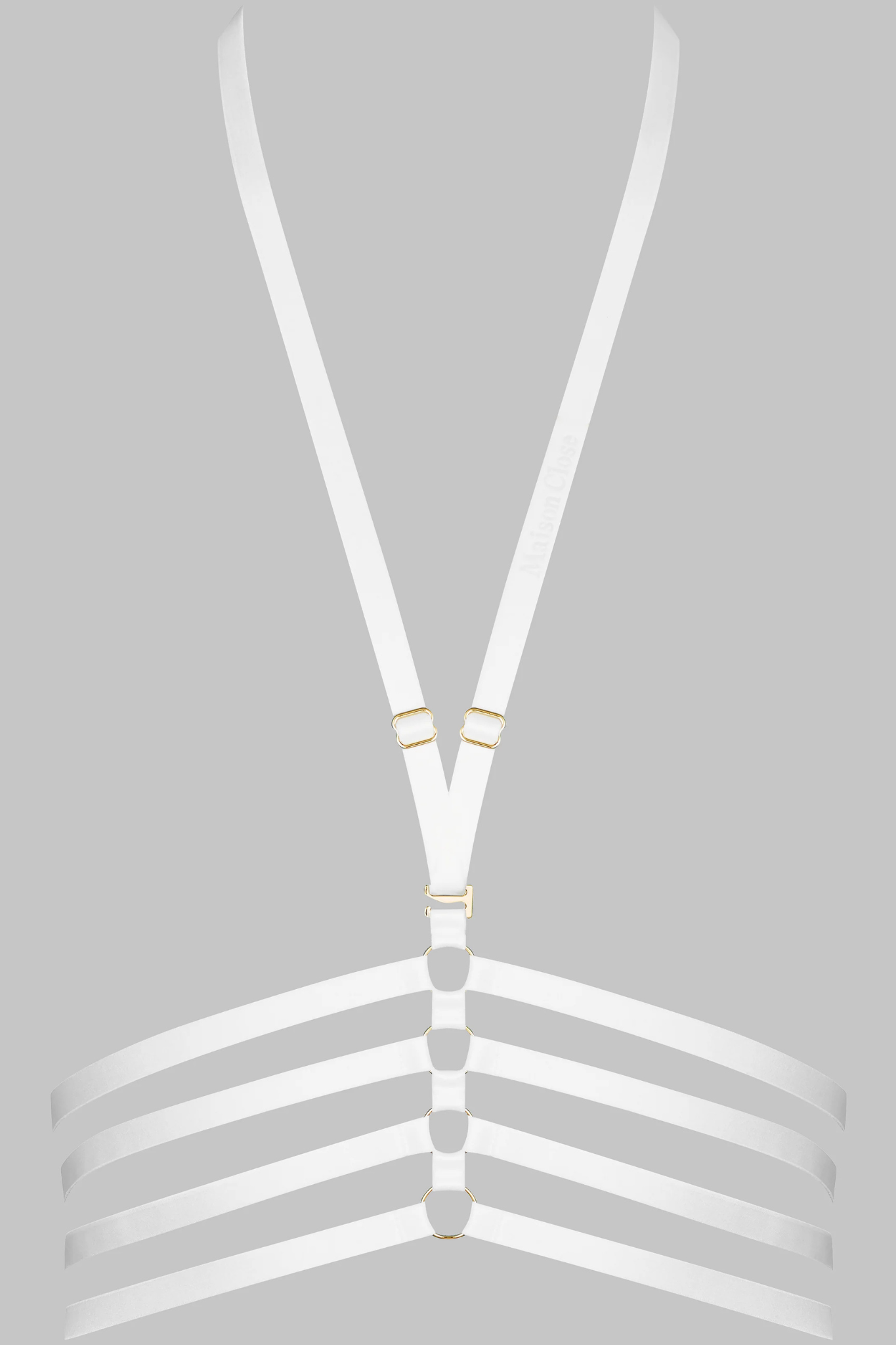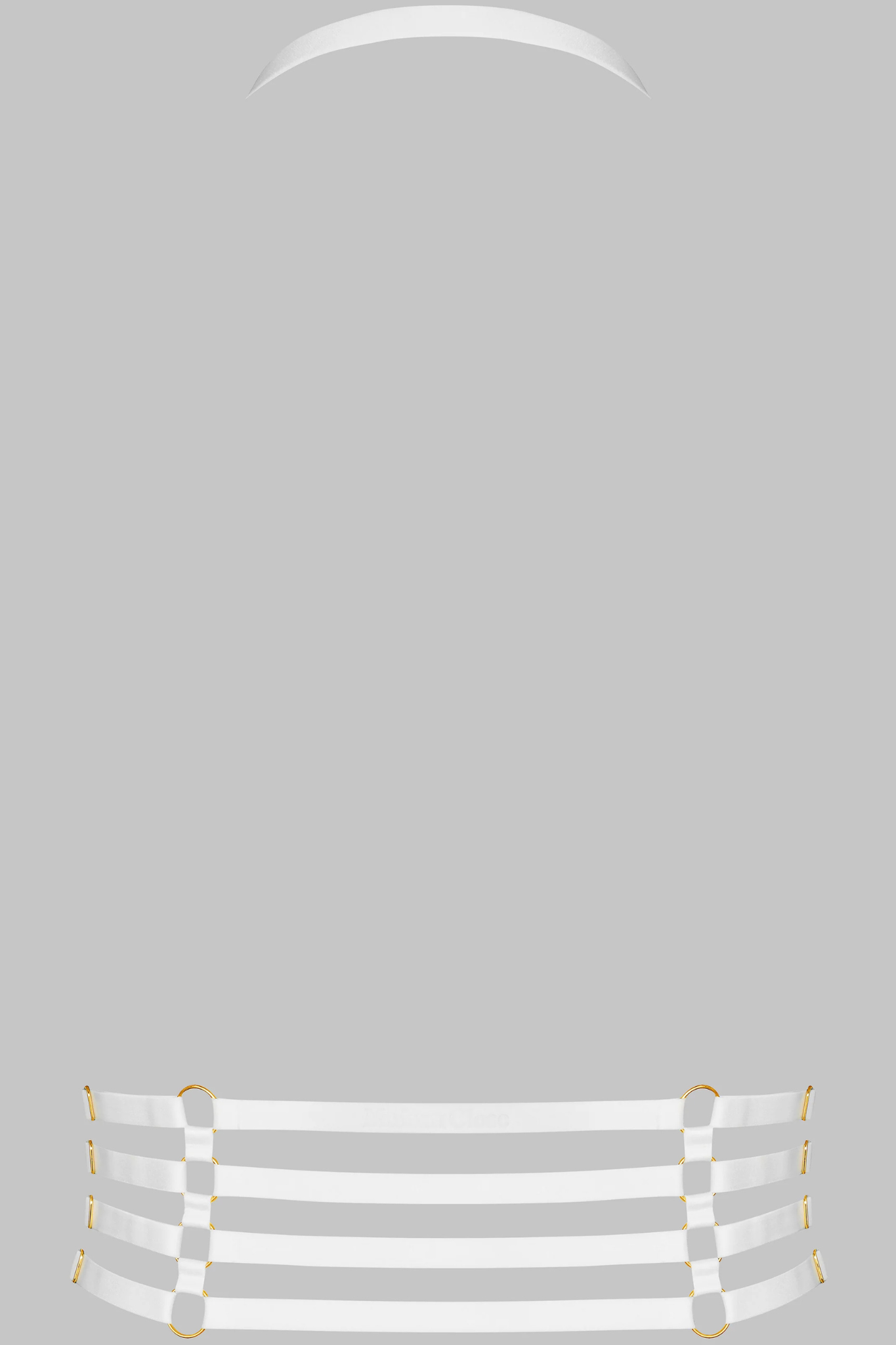 Upgrade your sensuality with the Maison Close Parure Signature White Harness, made with delicate elastic ribbons and golden hardware.
