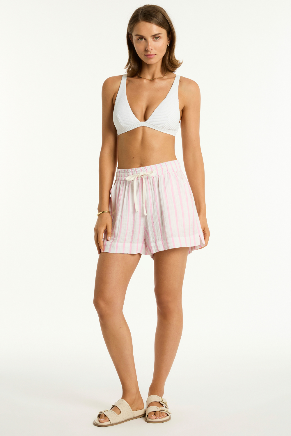 Sea Level’s Amalfi Pink Beach Shorts feature a bold stripe on soft double cotton gauze. With a high waist, elastic drawstring fit, and side pockets, they’re the perfect blend of comfort and chic holiday style.