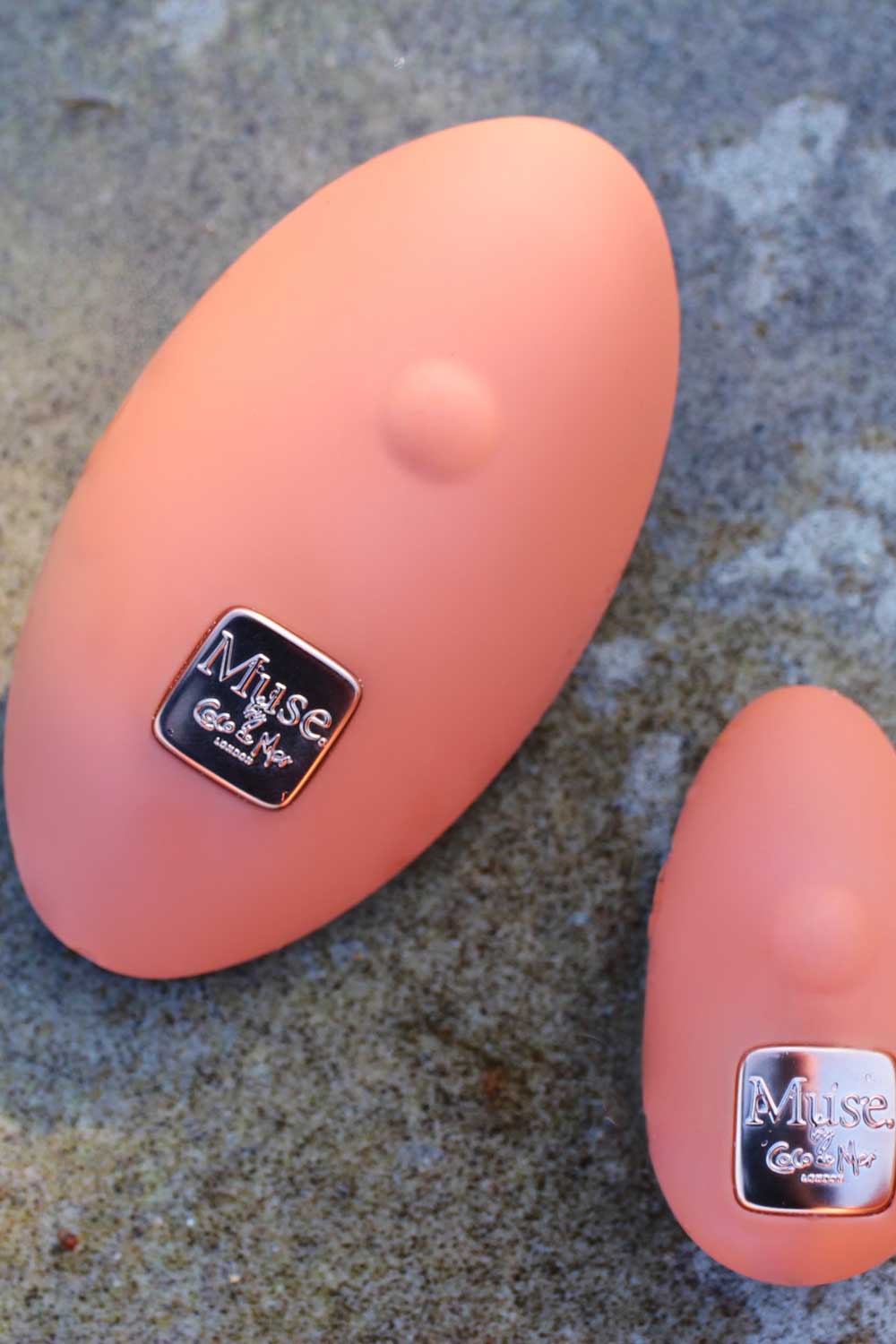 • Caramel silicone with Muse branding on a rose gold-coloured plate.