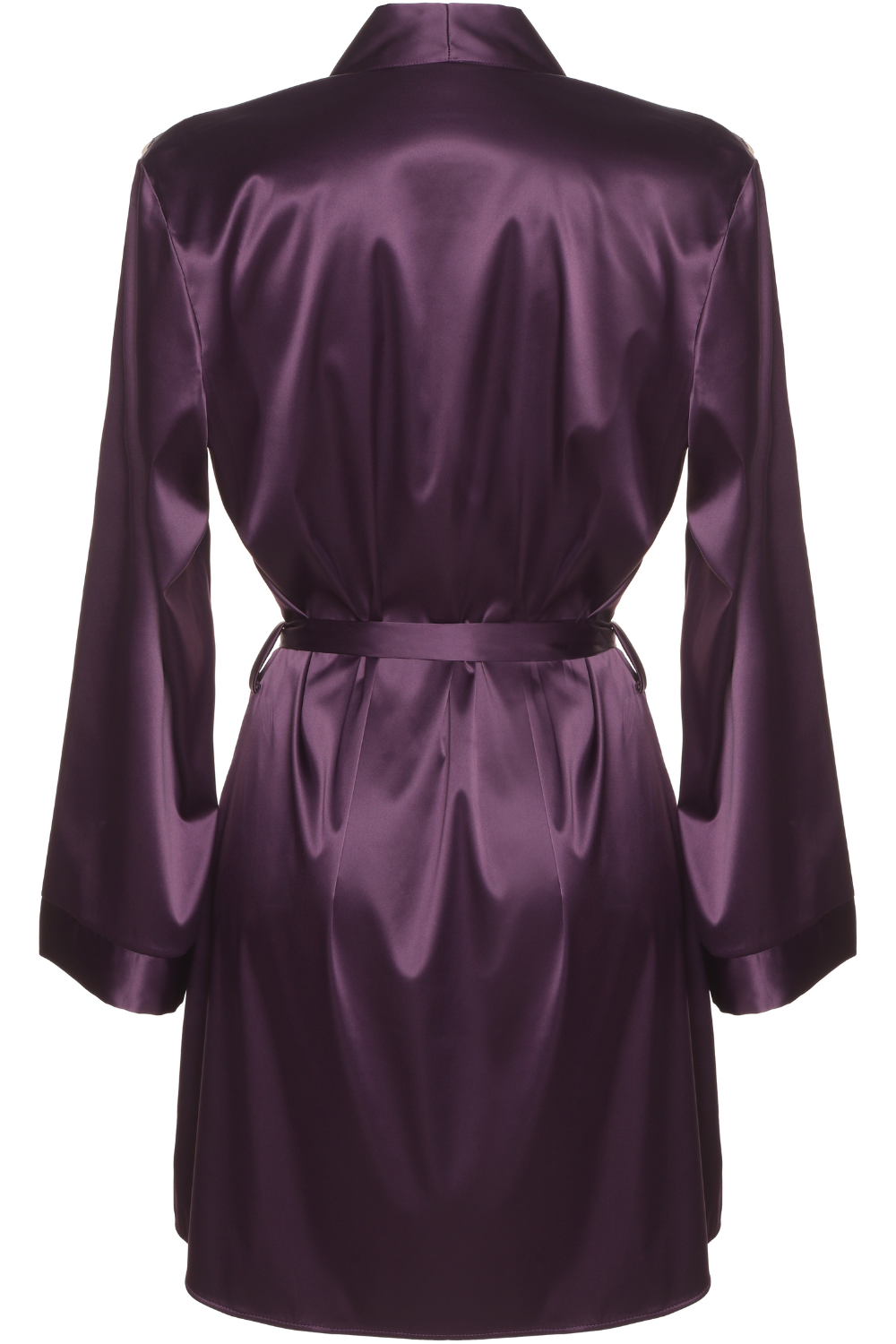The Venus violet Robe drapes beautifully in fluid satin, enhanced by intricate shoulder embroidery. Long, flowing sleeves, a short cut, and a self-tie belt create a refined, romantic silhouette.