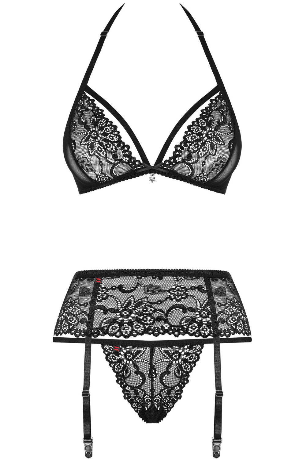 Lace lingerie set from ObsessiveTempt & tease... Discover the lacey three-piece set consisting of a bralette, mini thong and garter belt. The set is crafted from transparent floral lace & decorative straps, a sexy, sophisticated combination. Style with lace stockings for a night in with your lover.