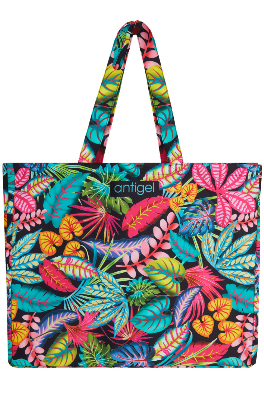 Discover effortless elegance in the sun with the La Forêt Magic tote bag. Featuring a colourful tropical print design on a black background and prestigious Antigel logo. Your perfect beach companion.