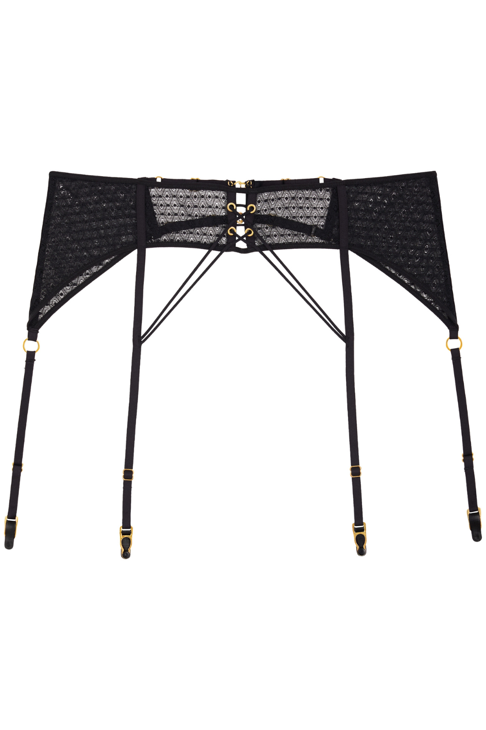 The Boîte à Désir Secret Language Suspender Belt seduces with graphic black fabric, lace-up corset-inspired details, and golden accents. Adjustable straps complete this irresistible piece, designed to elevate your lingerie look with bold elegance.