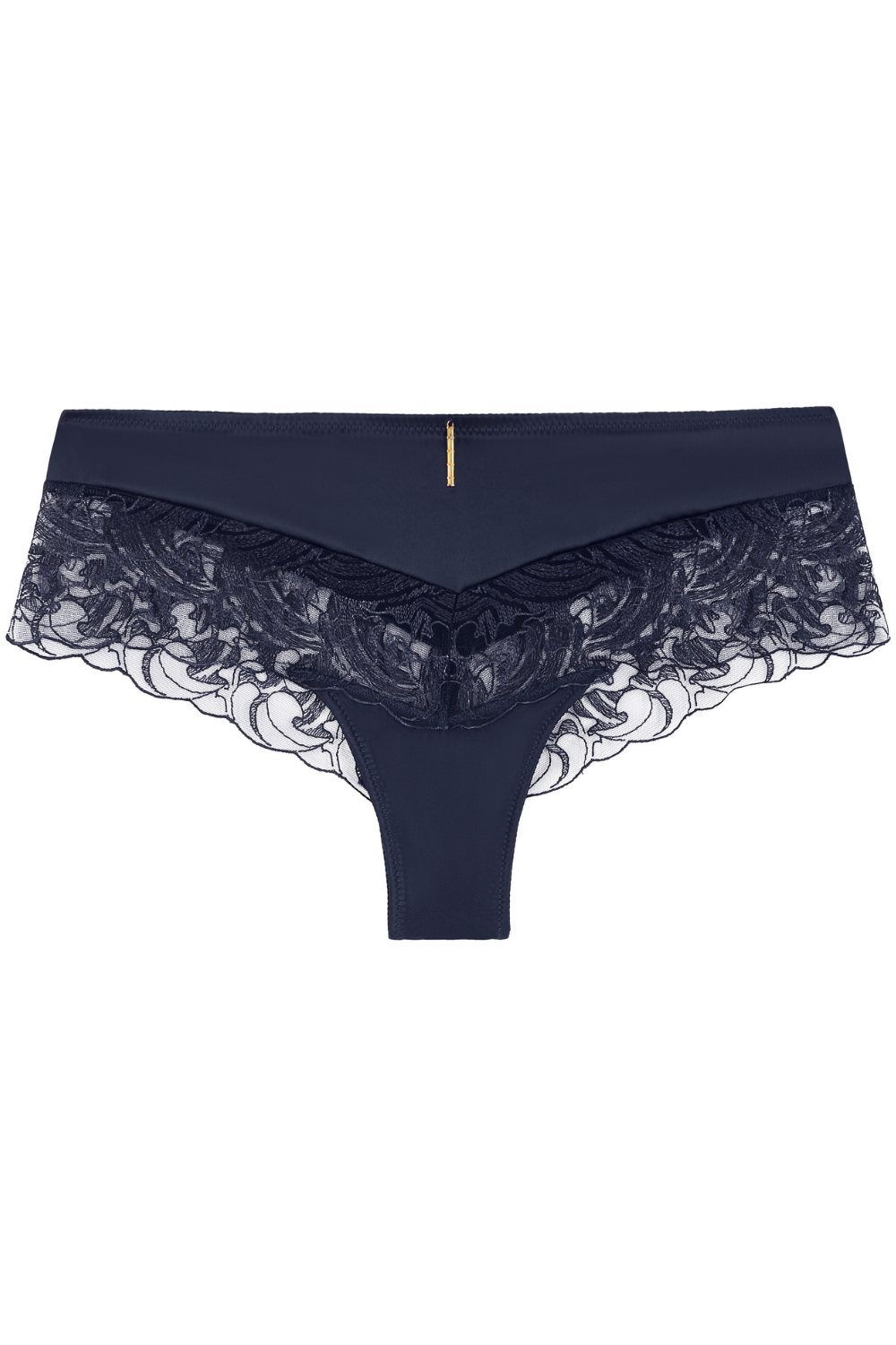 The Satin Memories navy blue Cheeky Brief pairs shimmering Italian satin with wave-inspired French embroidery to elegantly highlight the hips and rear. Finished with a golden bamboo charm at the waist, this luxurious brief combines sensuality, comfort, and timeless elegance.