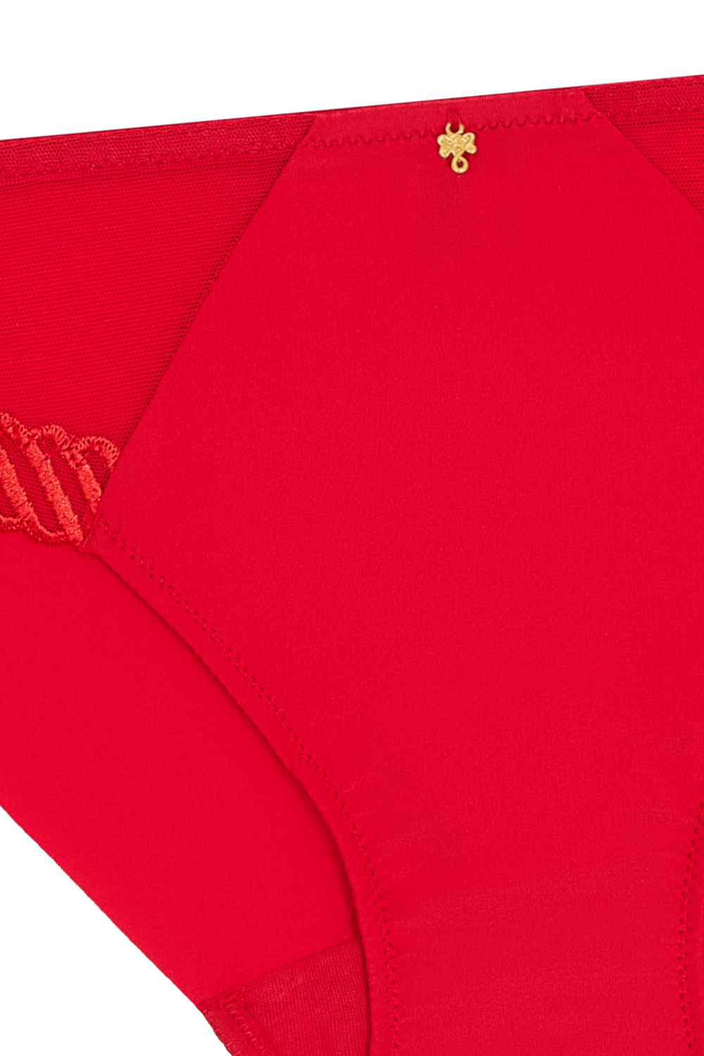 The Sheer Emotion Brazilian Brief in flamboyant, seductive red hugs the hips with sheer tulle and bold embroidery, finished with a modern gold charm. Soft, seam-free fabric at the back ensures smooth, no-show wear—luxurious, flattering, and irresistibly comfortable from every angle.