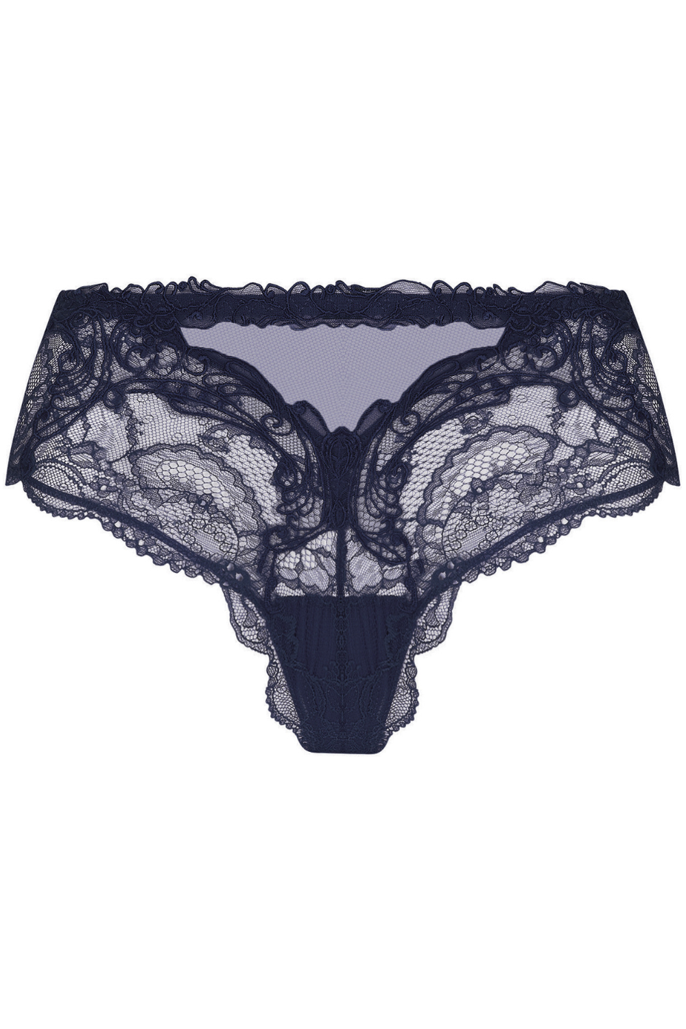 The Soir de Venise Shorty in Navy by Lise Charmel embodies the timeless elegance and sensuality of French couture lingerie. Crafted from luxurious Calais lace, this low-rise shorty delicately reveals the curves with refined allure.