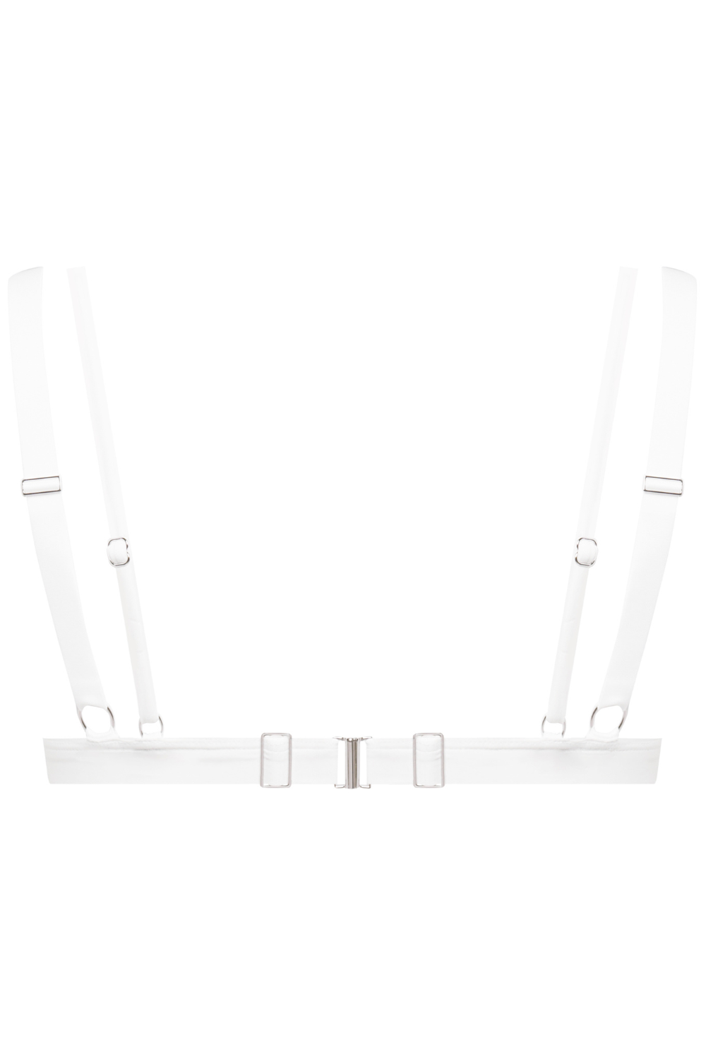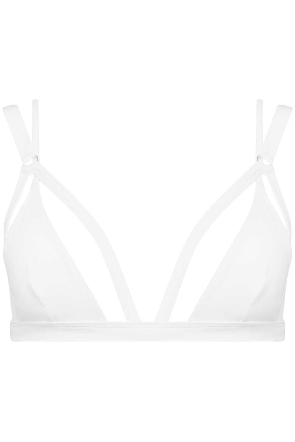 In crisp white, the Fatale Triangle Bikini Top offers a wireless, darted silhouette in silky soft microfibre. Framed with slender elastic straps for a luxe bondage look, it features silver adjusters and a back clasp. A supportive underbust band ensures comfort and shape.