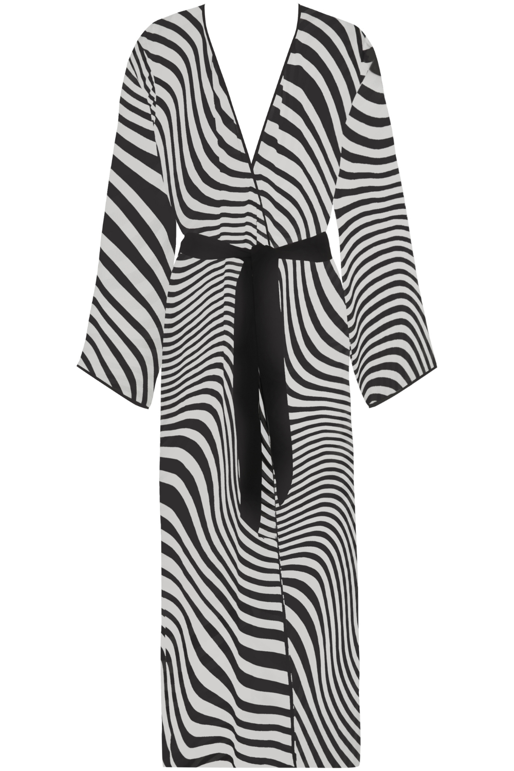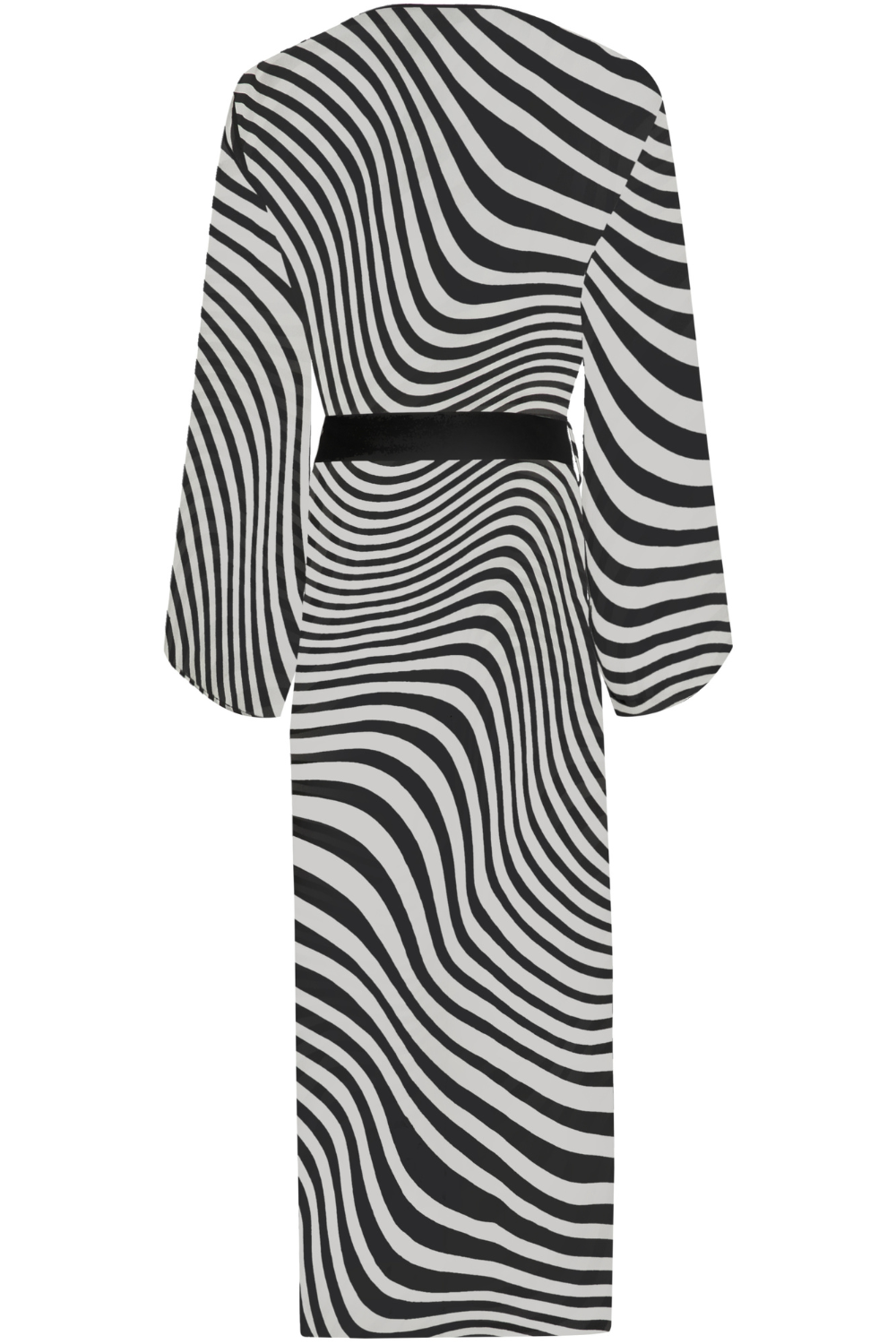The Fever Kimono in Black is crafted from airy, semi-sheer viscose crepe in a psychedelic print. Its wide sleeves and flowing silhouette add drama, while a removable black belt cinches the waist for versatile styling. A bold, luxurious cover-up perfect for poolside or resort chic.