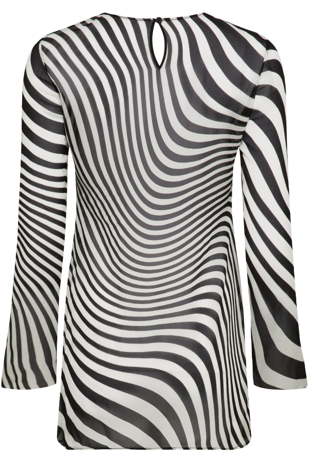 The Fever Short Beach Dress in black & white by Maison Close features a psychedelic print on fluid semi-sheer viscose. With a mini length cut, flared long sleeves, and a delicate keyhole back, it drapes effortlessly over swimwear for an elegant beach look.