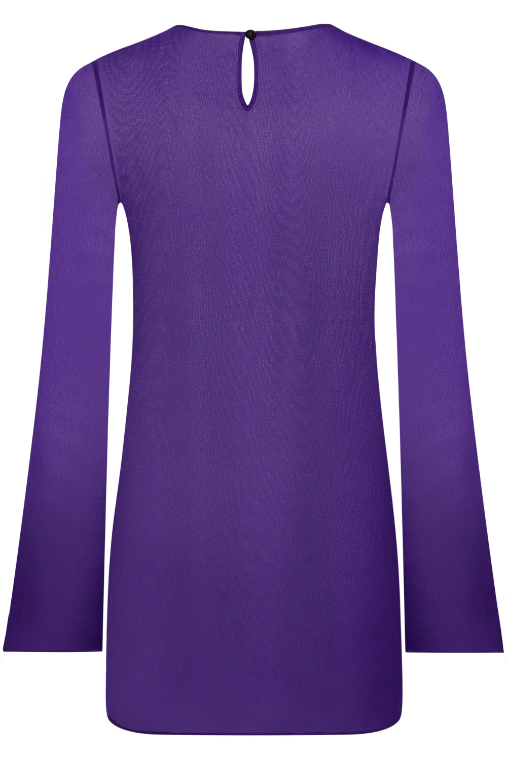 The Fever Short Beach Dress in electric violet by Maison Close features fluid, semi-sheer viscose with a vibrant finish. Its fitted mini cut, long flared sleeves, and delicate keyhole back offer an elegant, lightweight style perfect for layering over swimwear or wearing out.