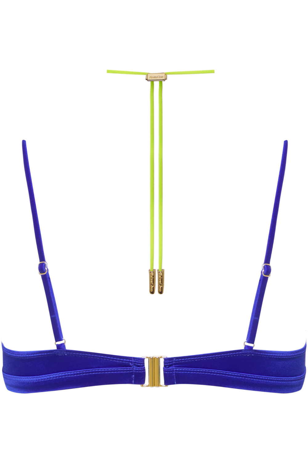 The Glow Bralette Bikini Top in blue stuns with its silky satin finish and elegant pleating. Wireless for natural support, it features a customizable yellow halterneck lacing with bold gold lipstick accents and a gold clasp back for a perfect, polished look.