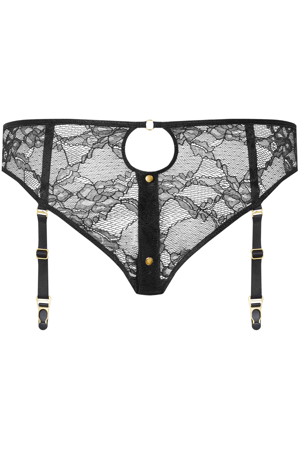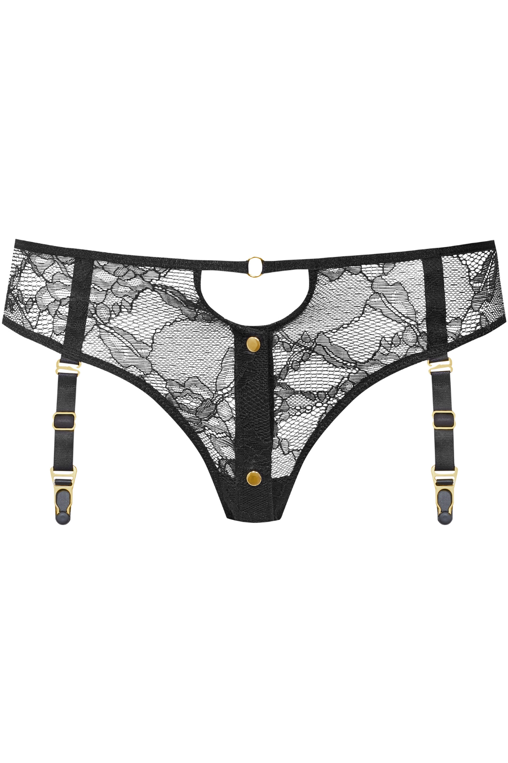 The Jeux Magnétiques Suspender Brief in black floral lace seduces with a magnetic crotch opening and teardrop cut-outs. Adjustable, removable garters with golden hardware let you reveal and play, framing the silhouette with daring elegance.