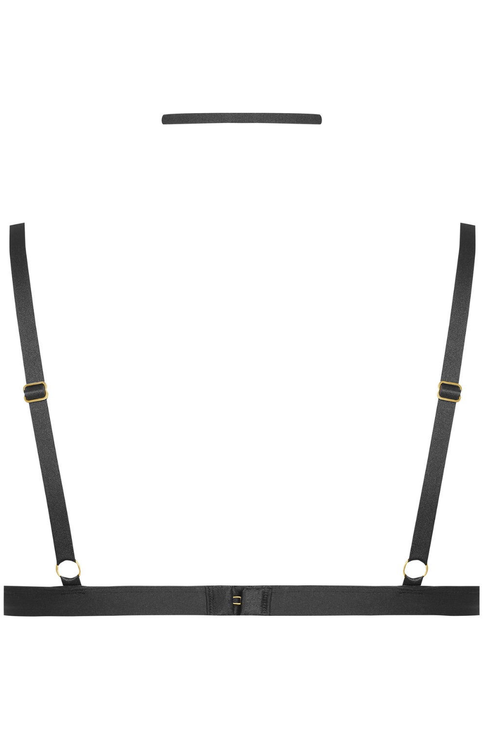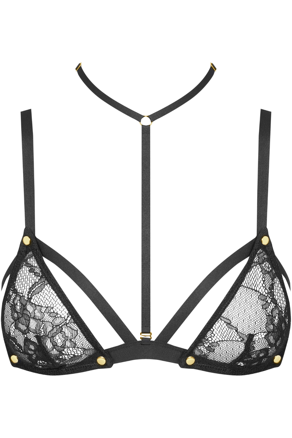 The Jeux Magnétiques Triangle Bra in black floral lace offers wireless comfort with removable panels and a detachable harness. Golden magnets let you reveal, transform, or play—turning every gesture into a bold, intimate moment of desire.