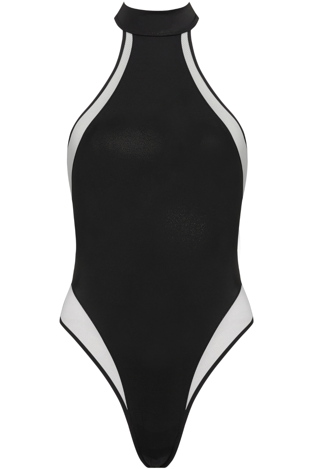 The Minuit halter-neck thong swimsuit fuses sheer tulle with glossy black microfiber for a striking, sculpted fit. With a shimmering finish and revealing back, the design flatters and elongates the figure while turning up the heat poolside or beyond.