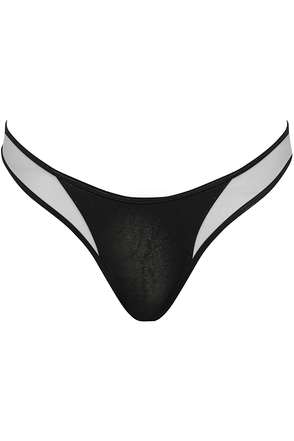 The Minuit Thong Bikini Bottom by French designer Maison Close seduces with a high-cut silhouette in sheer tulle and glossy black microfiber. A metallic finish adds subtle shine, while the thong cut and string sides create a leg-lengthening, sculpted look. Bold, refined, and made to mix and match with the matching Minuit bikini tops.