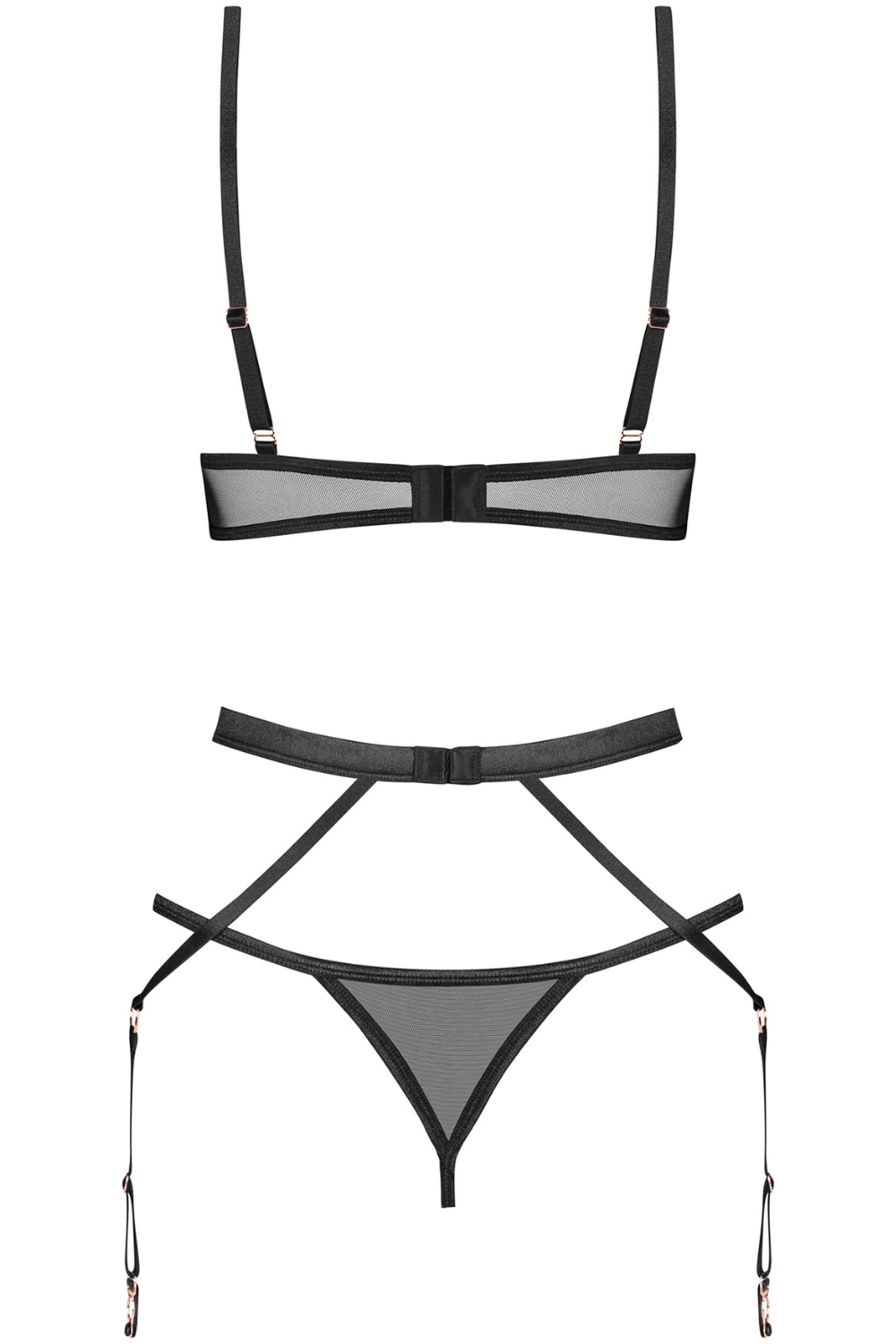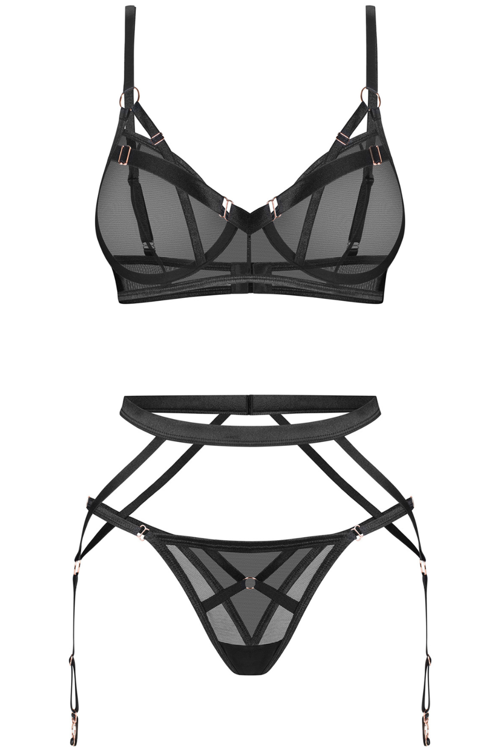Embrace timeless elegance with the Euridia 3-piece set in classic black. Featuring a wire bra, thong, and suspender, this lingerie set is designed to accentuate and flatter your curves.