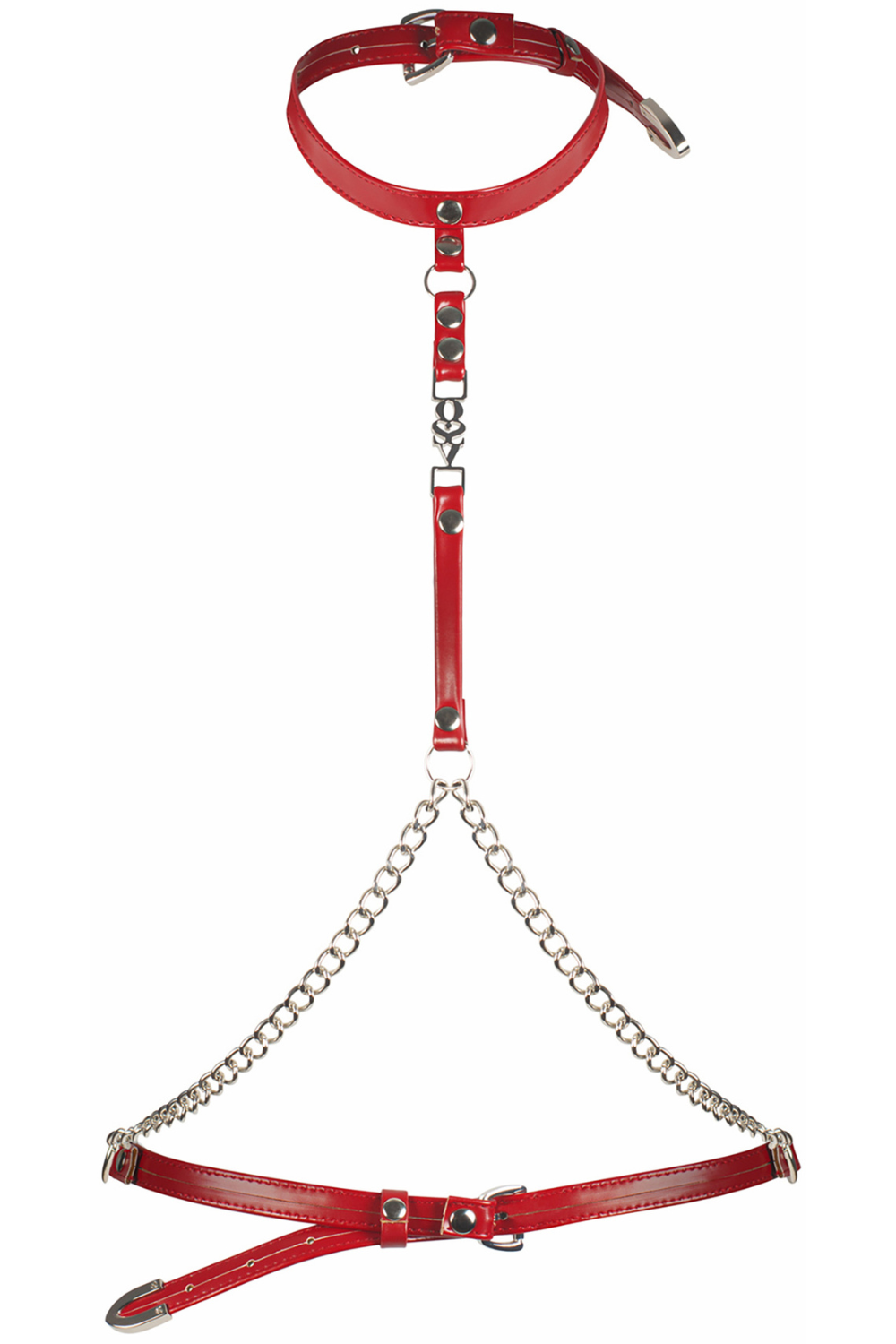 The Inferro red harness features a sleek choker and belt connected by silver chain detailing. Perfect for those who embrace their power with confidence and sophistication.