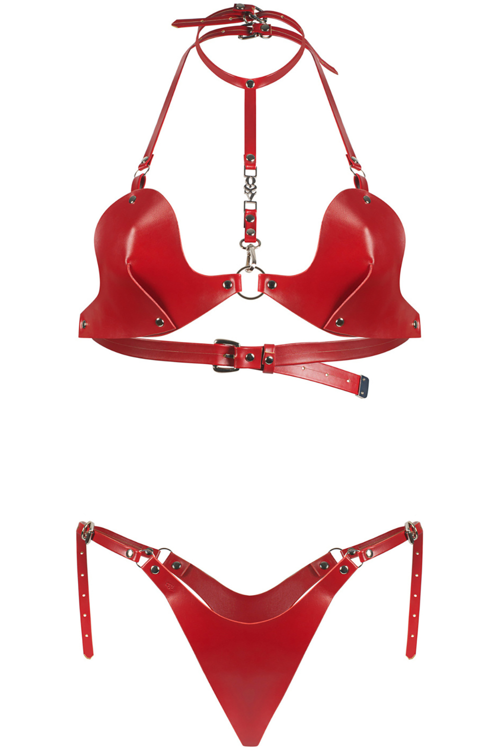 Make a statement with this bold red leather look lingerie set. Structured cups deliver serious style, while the neck-to-waist strap adds edge. The high-rise thong hugs your curves perfectly.