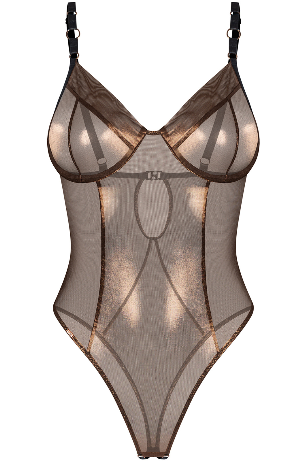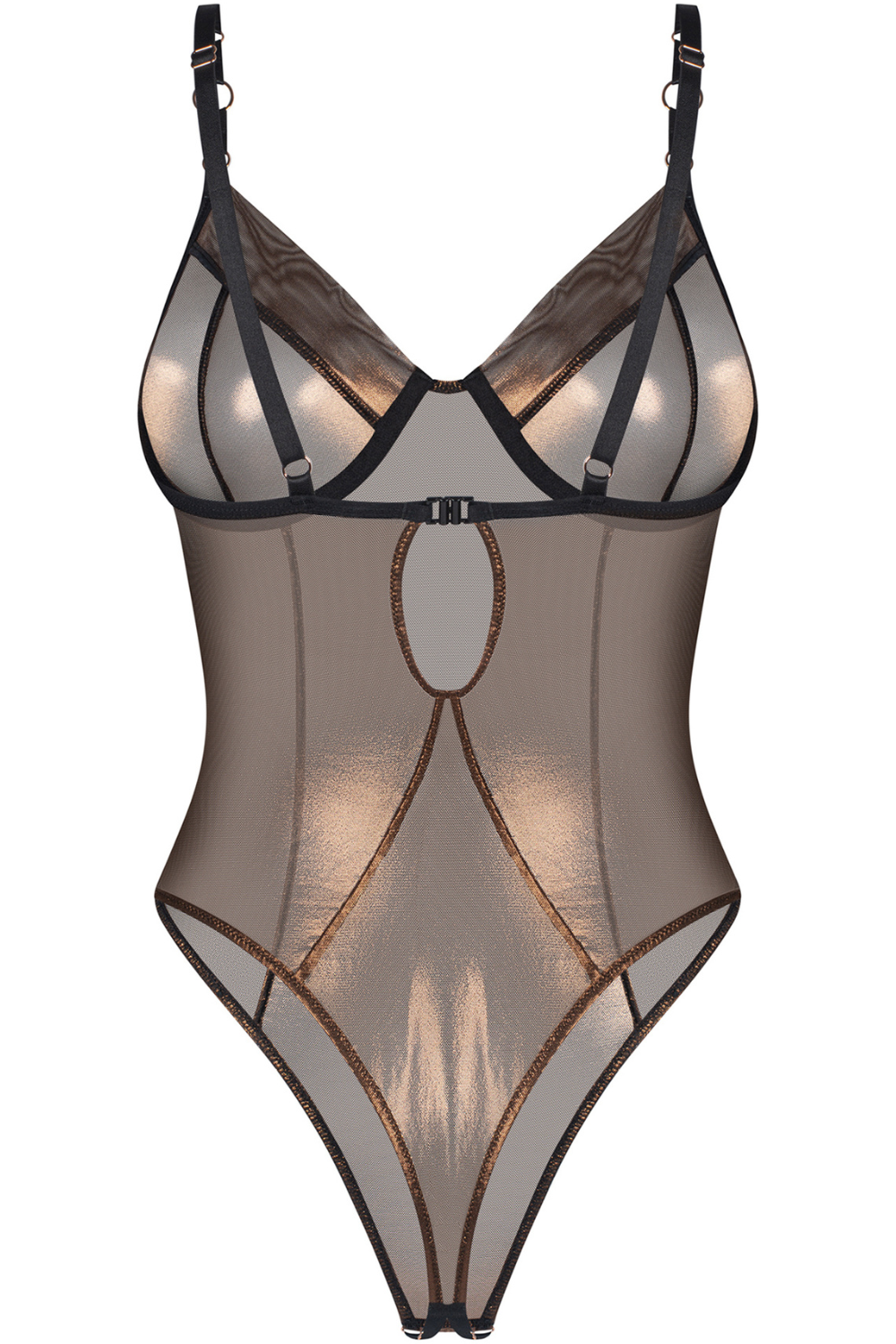 The Soranna bodysuit by Obsessive is crafted from sheer shimmer mesh that highlights your curves. The daring open crotch adds an irresistible touch, perfect for those moments when confidence meets charm.