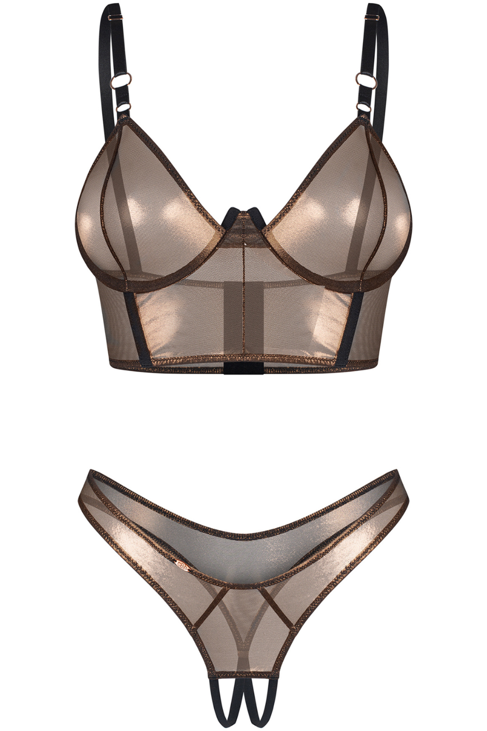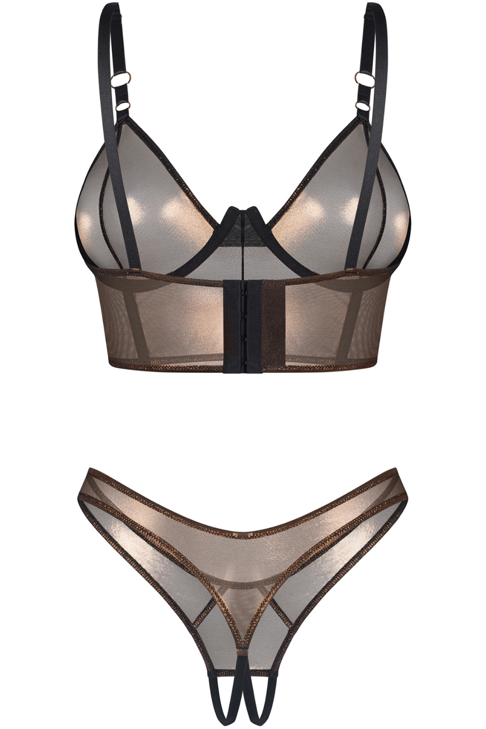 Turn up the heat with the Soranna two-piece set by Obsessive. The wire bra shapes and lifts for a flattering fit, while the open-crotch thong adds a mischievous twist to your lingerie game. With its sheer finish and bold design, this set is ready to make every moment a playful, unforgettable adventure.